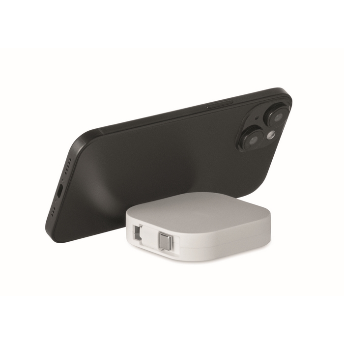 Zatahovací 100W nabíjecí a datový kabel. S funkcí držáku telefonu. Kabel z PVC v pouzdru z ABS. Přenos dat 480 Mb/s. Konektor Type-C na Type-C. Rozměry: 6.4 x 6.4 x 1.4 cm