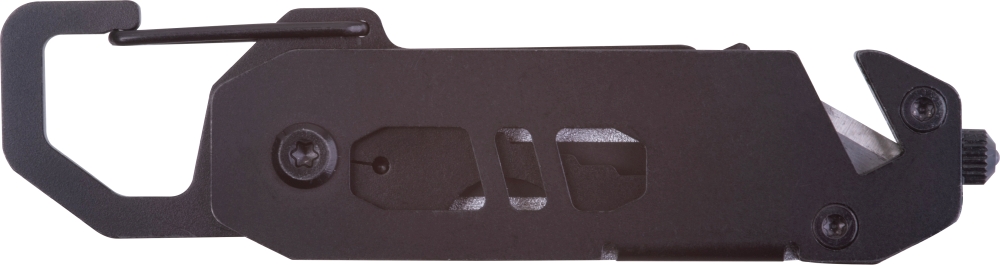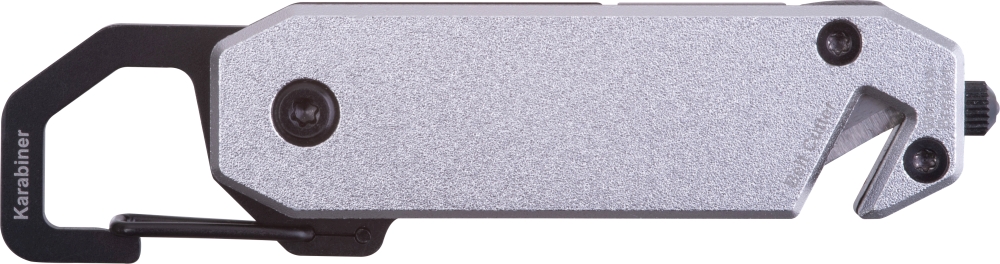 Multifunkční nástroj s hliníkovým pouzdrem a nástroji z nerezové oceli. 12 kusů. Obsahuje: klíč 3-8 mm, křížový a plochý šroubovák, karabinu, kladivo na rozbíjení skla, otvírák lahví a řezák bezpečnostních pásů. Rozměry: 8,8 x 2,2 x 0,8 cm