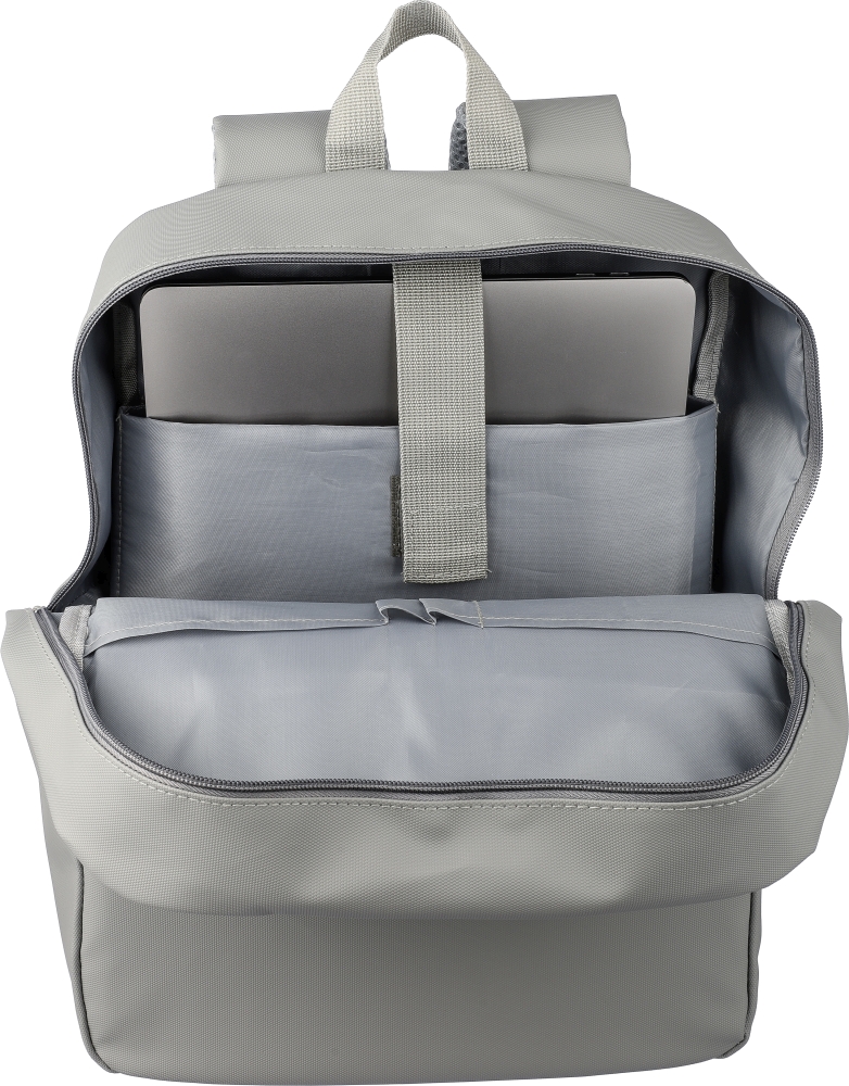 PU batoh na notebook (15 palců) se dvěma předními kapsami na zip, velkou přihrádkou na zip s částí na notebook uzavřenou na Velcro a několika kapsami uvnitř. Větraná polstrovaná zadní část s popruhem pro připevnění na kufr a nastavitelnými ramenními popruhy. Odpuzuje vodu.Rozměry: 12,5 x 30 x 41,5 cm