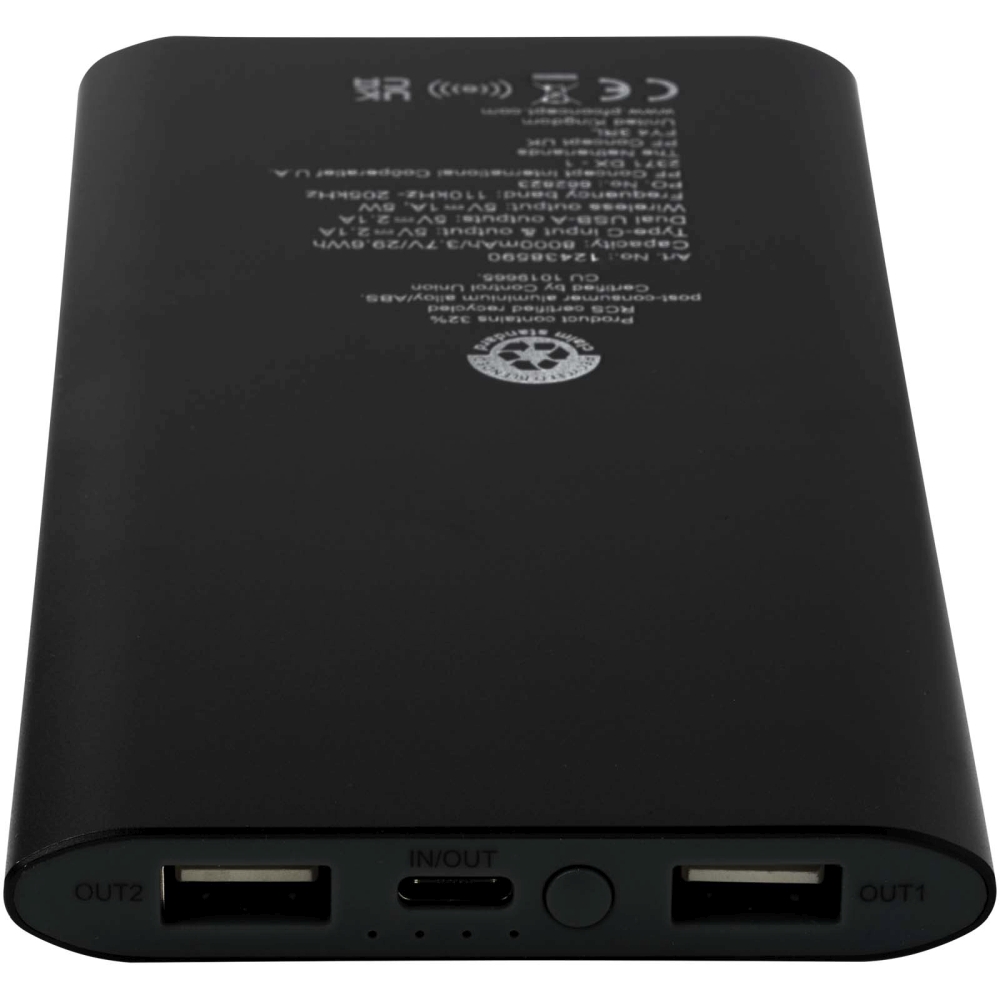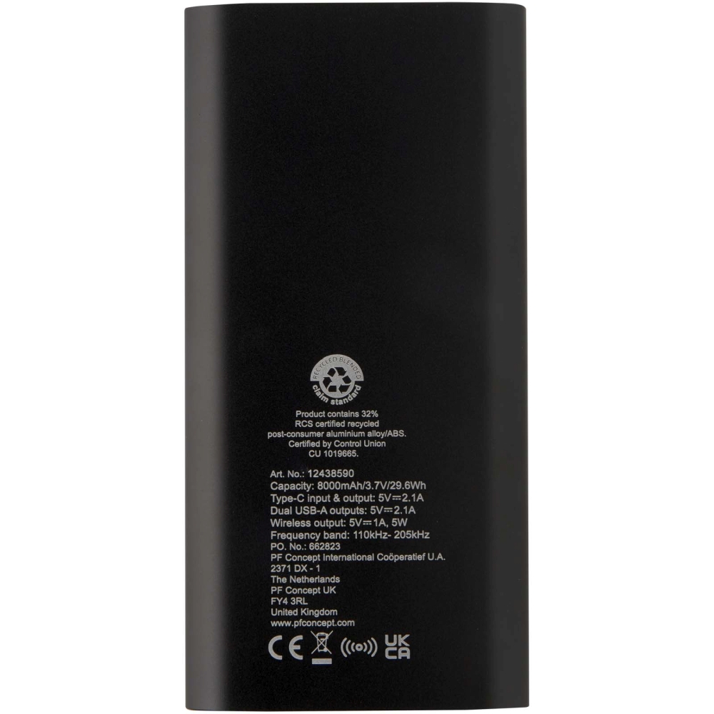 Powerbanka se vstupním/výstupním portem typu C a dvěma porty USB typu A, což znamená, že lze nabíjet 3 zařízení současně. Podporuje také 5W bezdrátové nabíjení pro všechna zařízení s podporou Qi. Powerbanka je vybavena 8000mAh lithium-polymerovou baterií, která poskytuje maximální celkový výstupní výkon 10 W. Tato powerbanka je vyrobena z 28 % z recyklovaného plastu. Dodáváno s nabíjecím kabelem TPE typu C na USB typu A. Rozměry: 15 x 1,2 x 7,4 cm