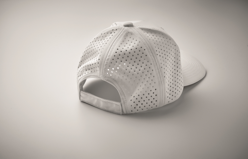Pětipanelová polyesterová funkční čepice s nastavitelným zapínáním na suchý zip a laserem perforovanými otvory a 2 prošitými očky v odpovídající barvě. Vložka je rychleschnoucí, odpuzuje pot a vodu. 130 gr/m2 Rozměry: 21 x 16 x 11 cm
