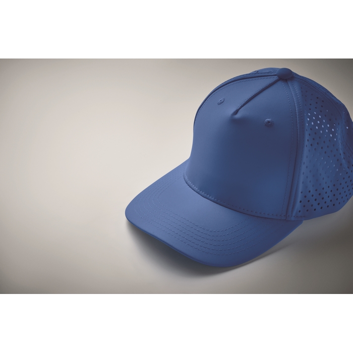 Pětipanelová polyesterová funkční čepice s nastavitelným zapínáním na suchý zip a laserem perforovanými otvory a 2 prošitými očky v odpovídající barvě. Vložka je rychleschnoucí, odpuzuje pot a vodu. 130 gr/m2 Rozměry: 21 x 16 x 11 cm