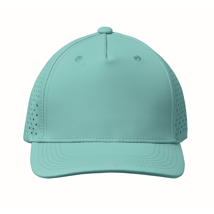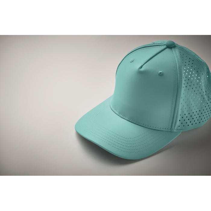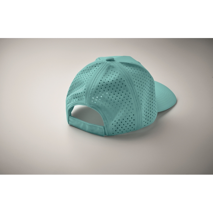 Pětipanelová polyesterová funkční čepice s nastavitelným zapínáním na suchý zip a laserem perforovanými otvory a 2 prošitými očky v odpovídající barvě. Vložka je rychleschnoucí, odpuzuje pot a vodu. 130 gr/m2 Rozměry: 21 x 16 x 11 cm