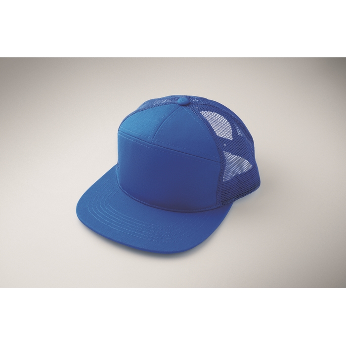 Sedmipanelová kšiltovka s plochým kšiltem z bavlněného 235g kepru s polyesterovou síťovinou na zadní straně a plastovým zapínáním. Rozměry: 22 x 16 x 11.5 cm