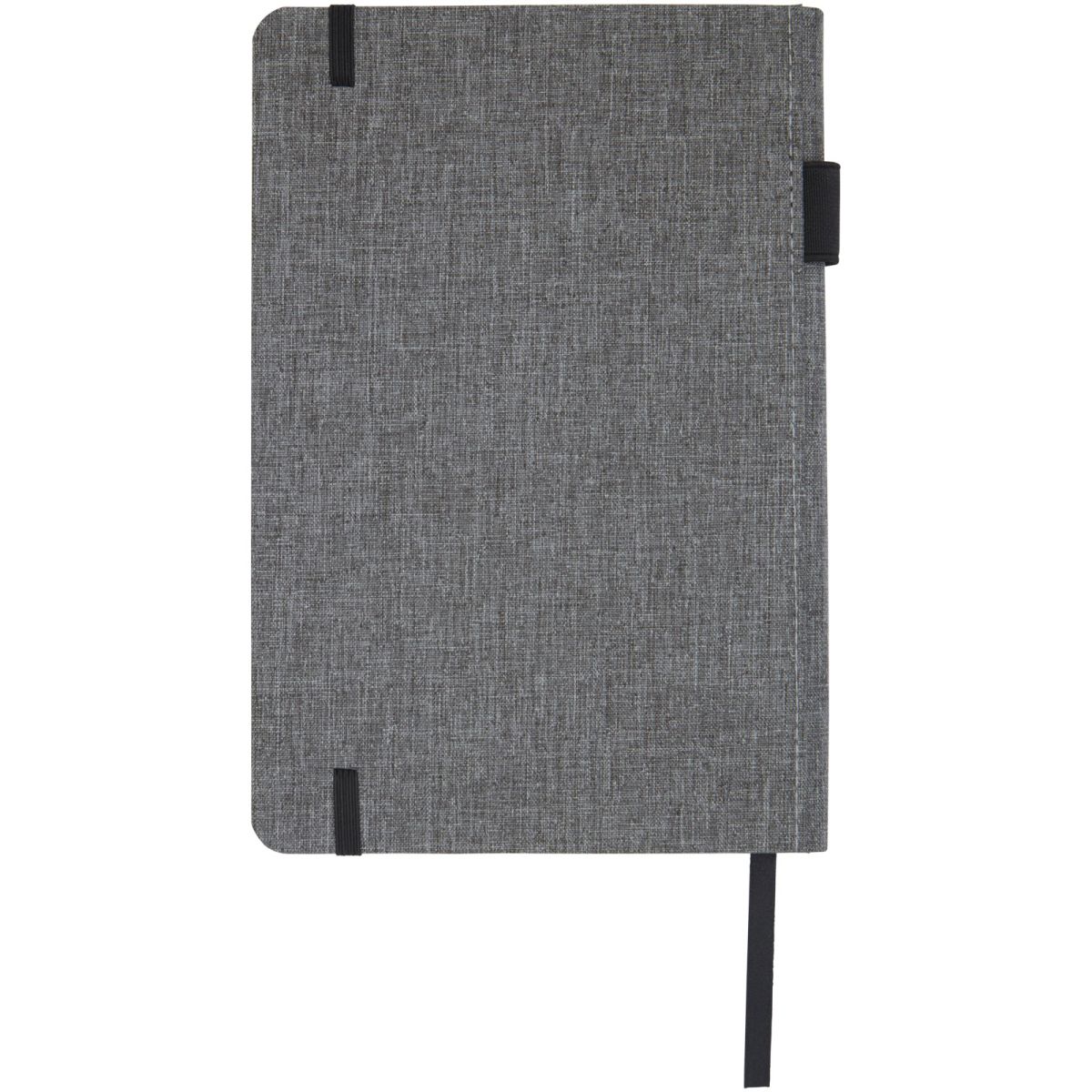 Poznámkový blok velikosti A5 s obálkou z RPET tkaniny. Obsahuje 96 listů linkovaného recyklovaného papíru 70 g/m2 se stuhovou záložkou a poutkem na pero. Lepenkový obal. Rozměry: 21,5 x 14,5 cm.
