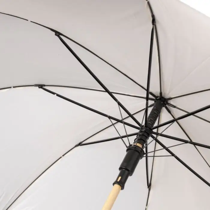Automatický golfový deštník z rPET 190T s osmi panely a bambusovou rukojetí. Tělo z bambusu a oceli s kovovým rámem. Součástí je zapínání na suchý zip a štítek z rPET. Rozměry: 102 cm x 102 cm x 82 cm