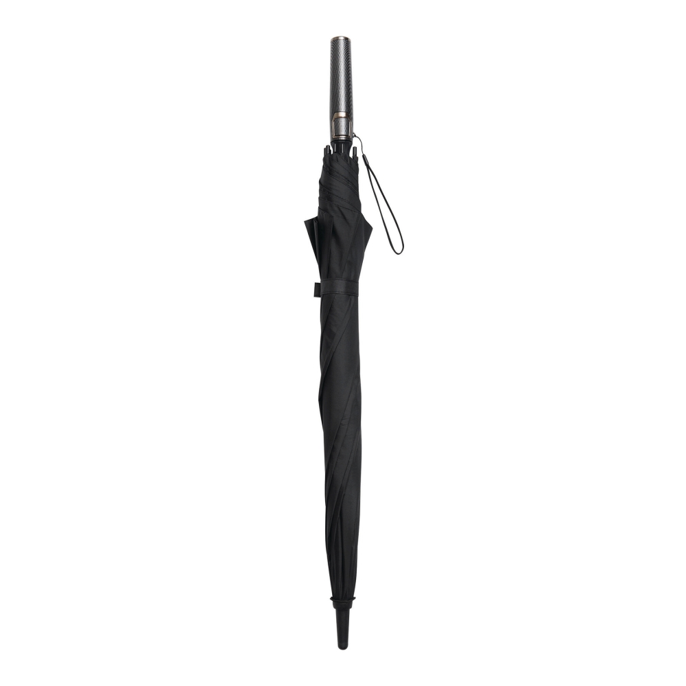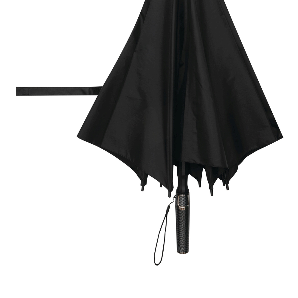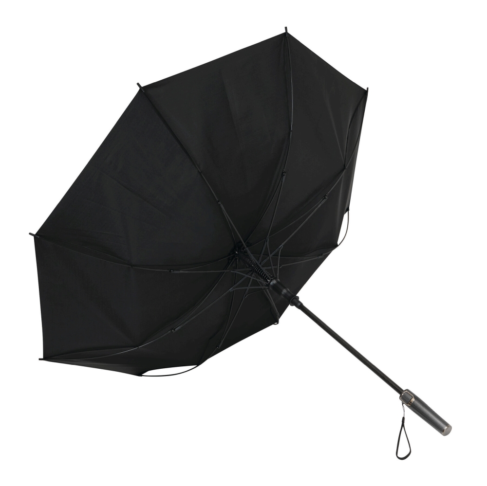 Automatický deštník s laminátovou rukojetí, laminátovými žebry, plastovými špičkami, plastovou rukojetí s karbonovým vzhledem s integrovaným drukem a poutkem na nošení, stříškou z prémiového polyesteru a zapínáním na suchý zip. Rozměry: O106 / 81,5 cm
