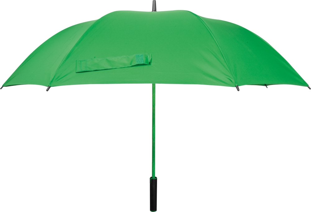 Klasický deštník s integrovanou kruhovou rukojetí, automatickým otvíráním, rámem a žebry ze sklolaminátu. Vyrobený z materiálu 190T pongee. Rozměry: o 120 x 93 cm