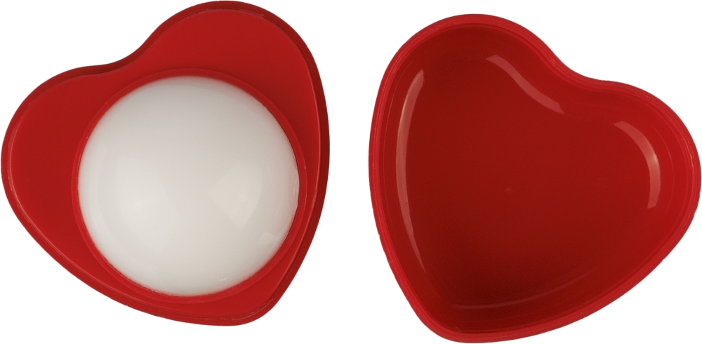 PP dóza ve tvaru srdce s 5,5 g balzámu na rty s vanilkovou vůní. Rozměry: 4 cm x 3,2 cm