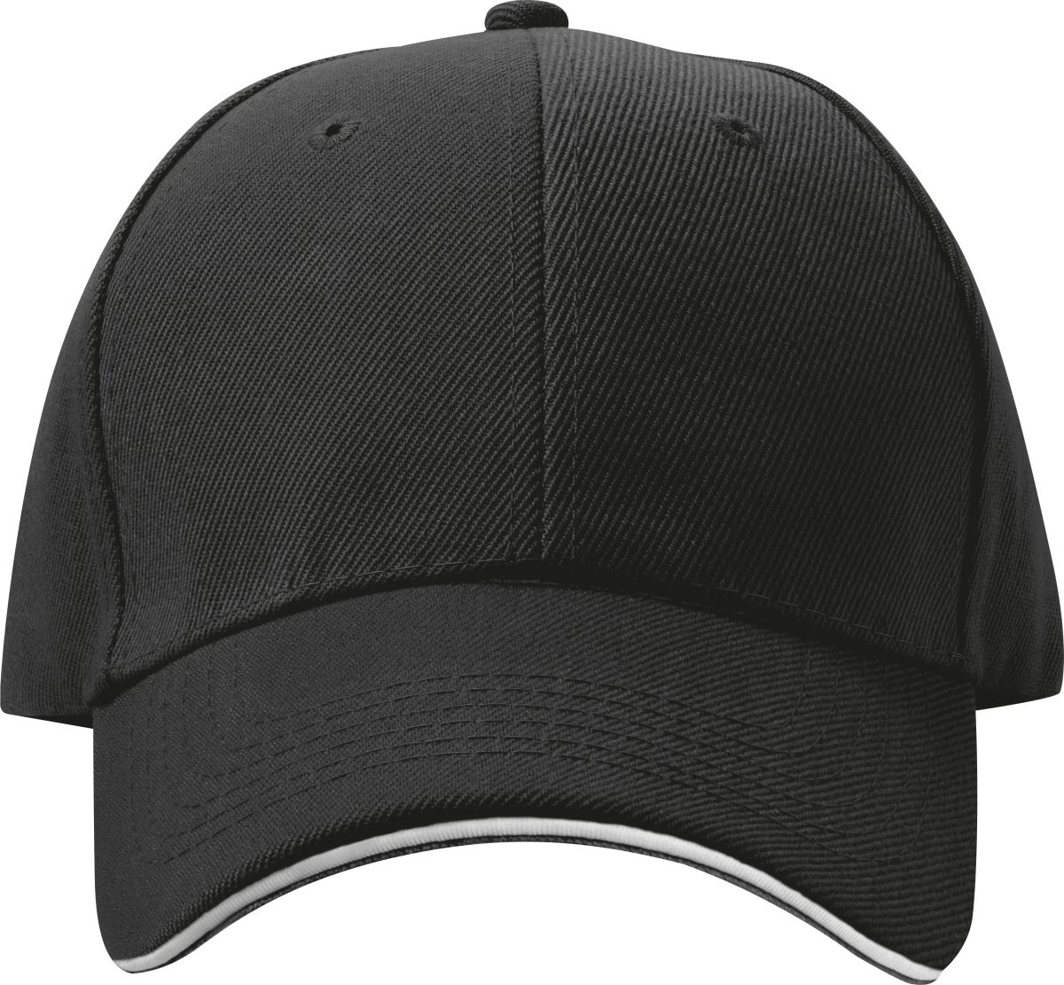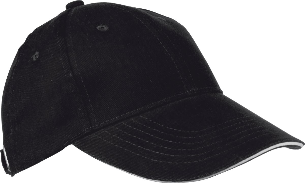 Šestipanelová baseballová čepice z česané bavlny s bílým proužkem na kšiltu a kovovým zapínáním, neobsahuje AZO prvky. Černá barva.
