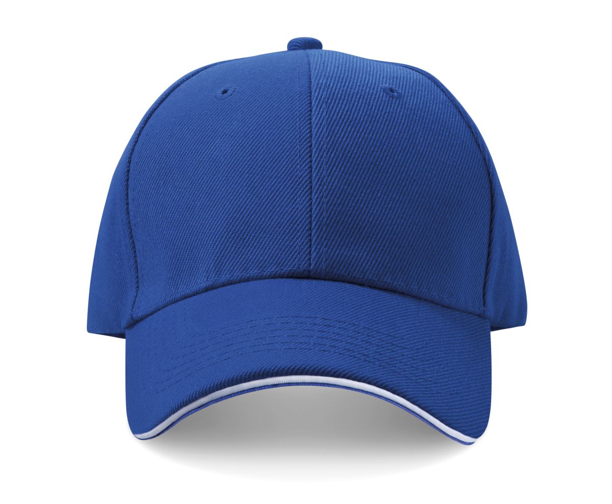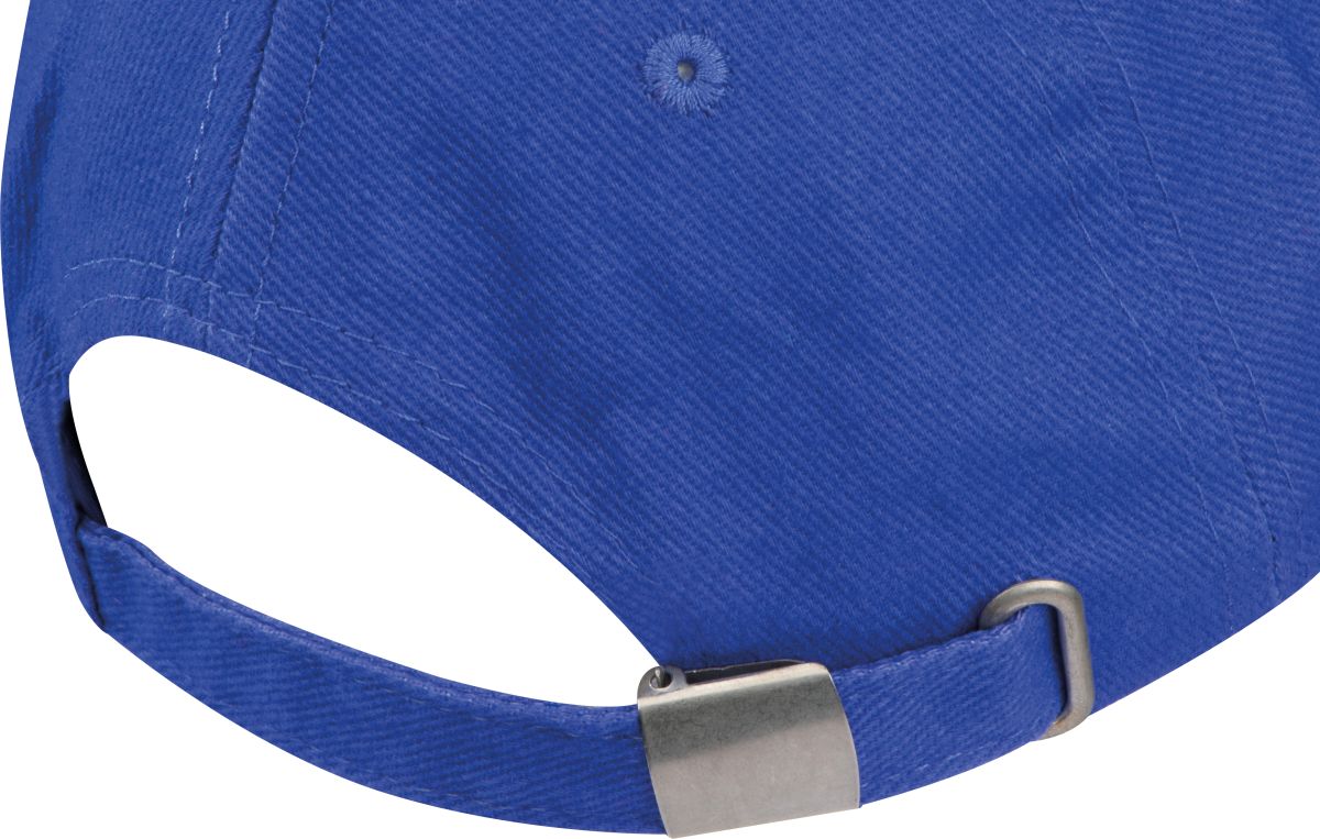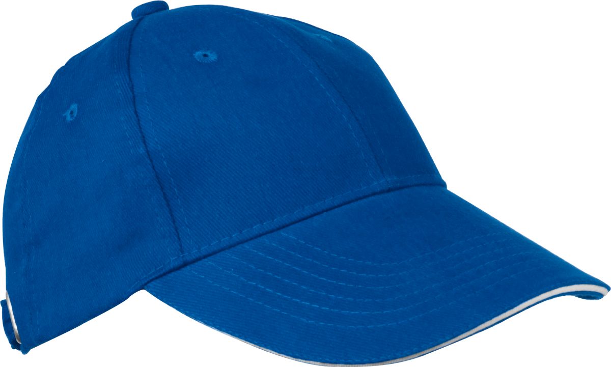 Šestipanelová baseballová čepice z česané bavlny s bílým proužkem na kšiltu a kovovým zapínáním, neobsahuje AZO prvky. Modrá barva.
