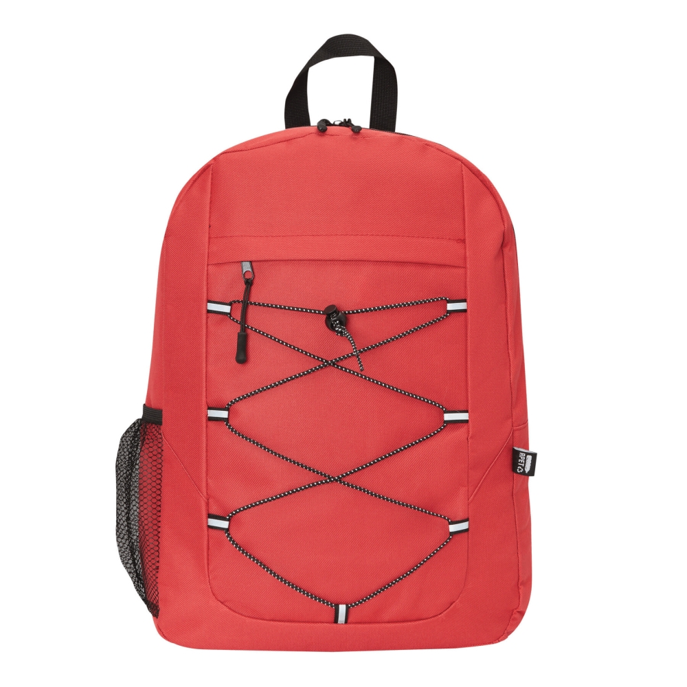 Batoh z recyklovaného polyesteru, hlavní kapsa na zip, přední kapsa na zip s nastavitelnou elastickou stahovací šňůrkou, poutko na nošení, 1 boční síťovaná kapsa, polstrované dno, nastavitelné polstrované ramenní popruhy. Rozměry: 30 x 15 x 43 cm