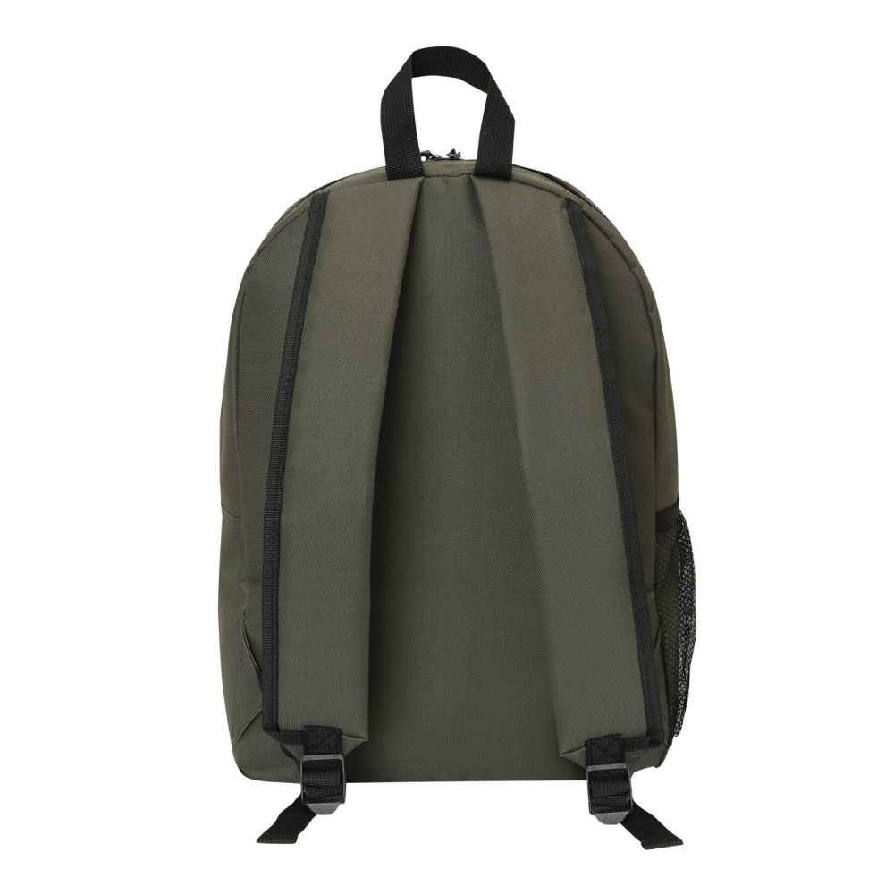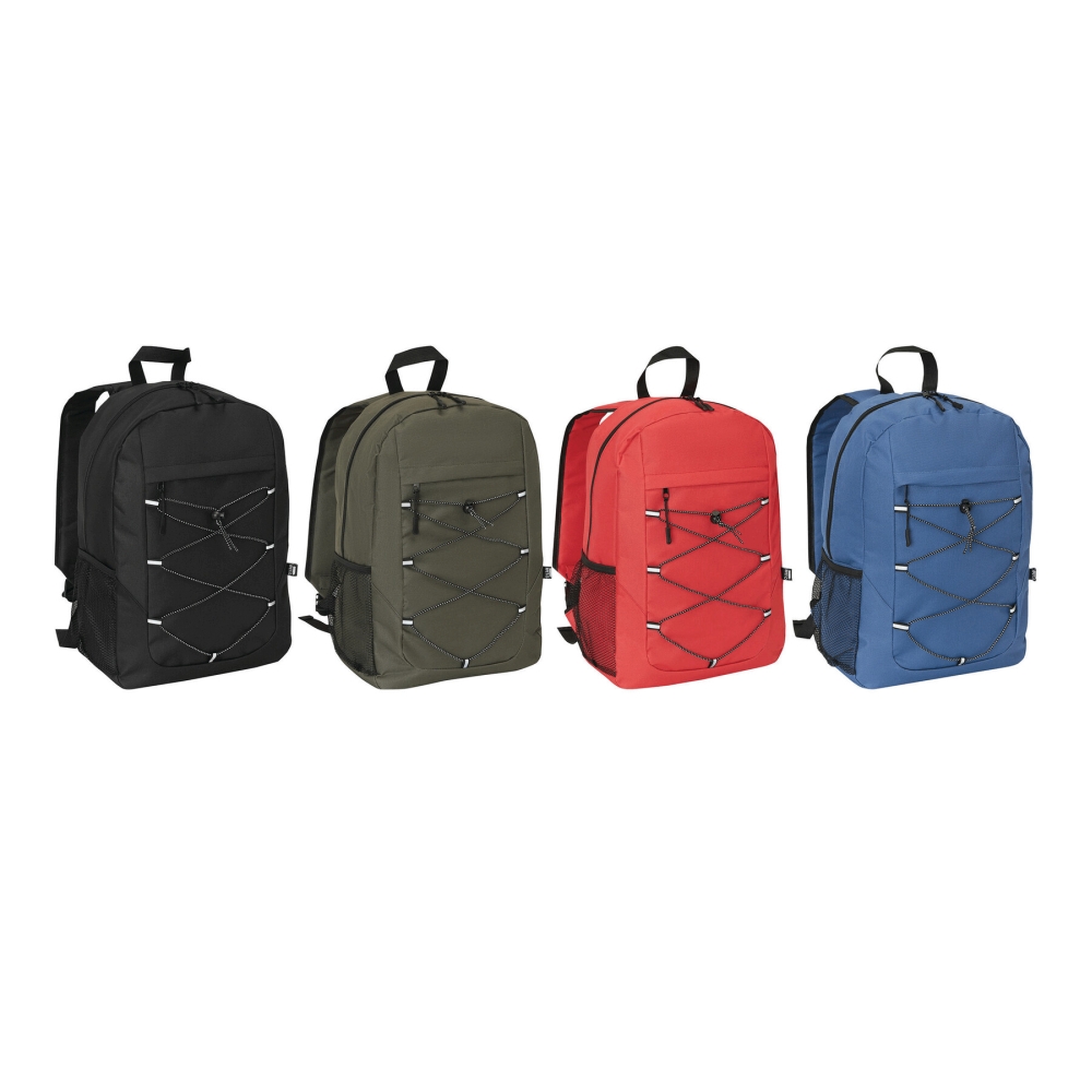 Batoh z recyklovaného polyesteru, hlavní kapsa na zip, přední kapsa na zip s nastavitelnou elastickou stahovací šňůrkou, poutko na nošení, 1 boční síťovaná kapsa, polstrované dno, nastavitelné polstrované ramenní popruhy. Rozměry: 30 x 15 x 43 cm