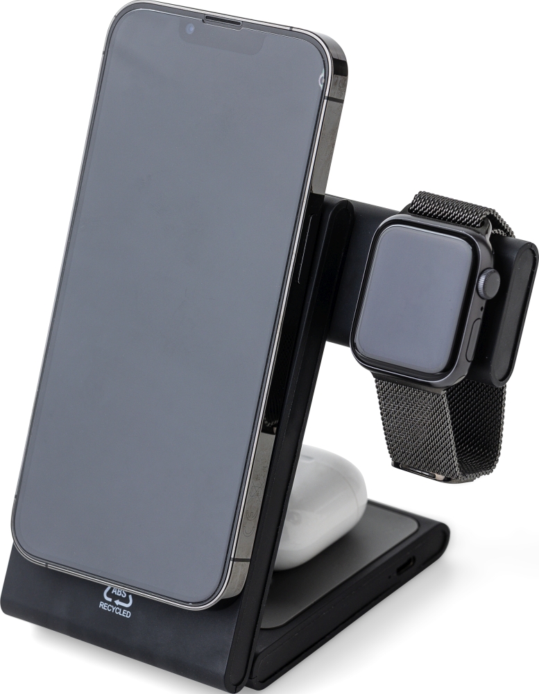Magnetická nabíječka 3 v 1 z recyklovaného ABS plastu pro telefon (15 W), AirPods (5 W) a iWatch (2 W). Ultra plochá se skládacím stojánkem. Vstup: 5 V/3 A nebo 9 V/3 A. Recyklované logo. Baleno v hnědé krabičce. Rozměry: 2,22 cm x 12,7 cm