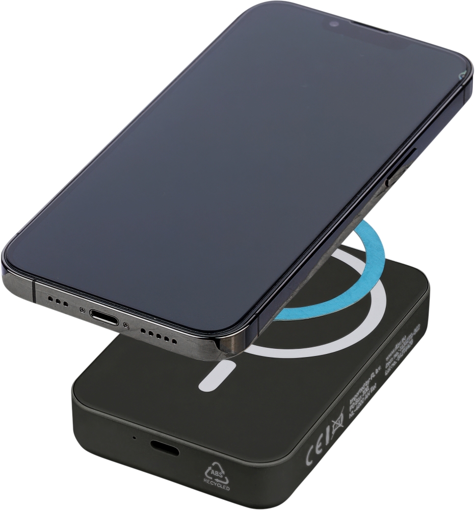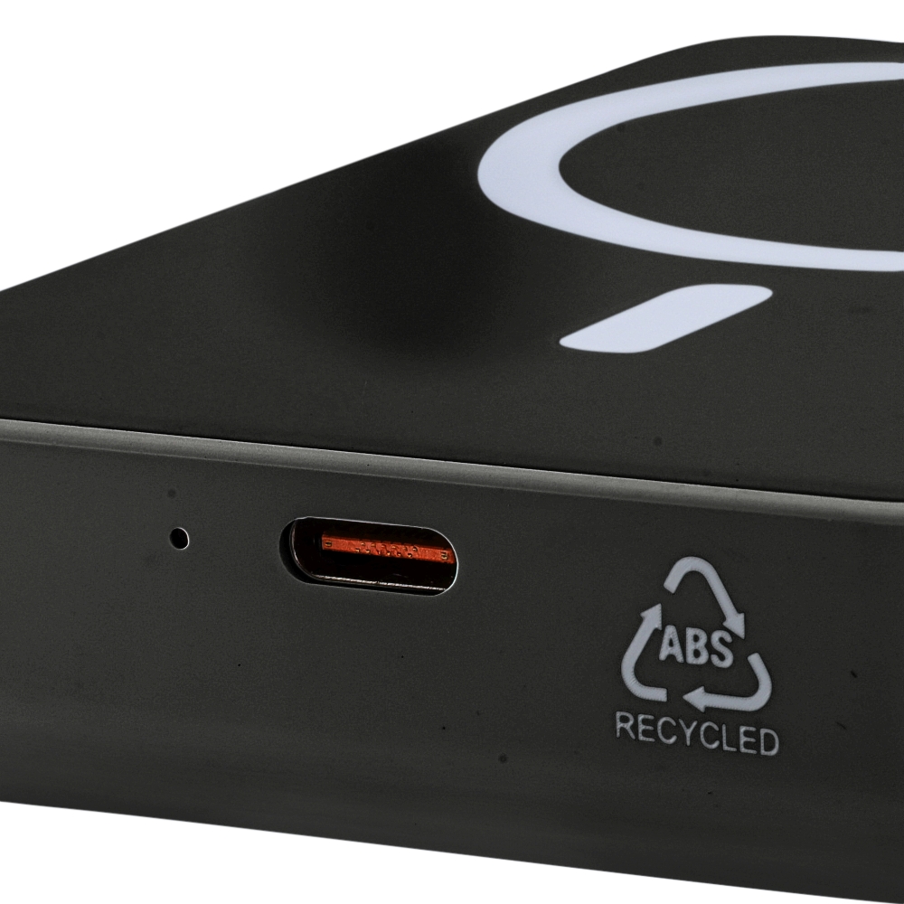 Bezdrátová nabíječka s recyklovaným konektorem powerbanka s velkou baterií 10 000 mAh a bezdrátovým nabíjecím výkonem 15 W, kompatibilní s MagSafe. Podporuje vstup a výstup typu C pro efektivní nabíjení. Vestavěné bezpečnostní prvky zahrnují ochranu proti přehřátí, zkratu, přepětí a nadproudu. Dodává se s extra kovovým kroužkem a lepicí podložkou pro použití se zařízeními bez MagSafe. Baleno jednotlivě v hnědé kartonové krabici s ilustrací a hedvábným papírem, bez plastu. Boční štítek obsahuje informace o produktu a logo z recyklovaného ABS plastu. Rozměry: 2,4 x 9,7 cm