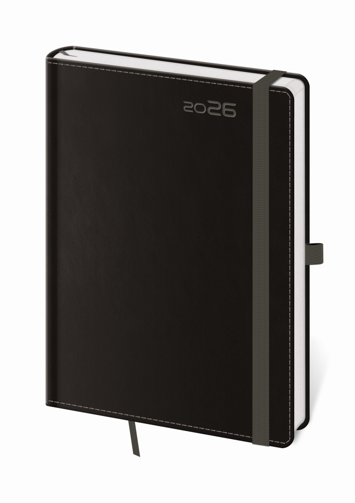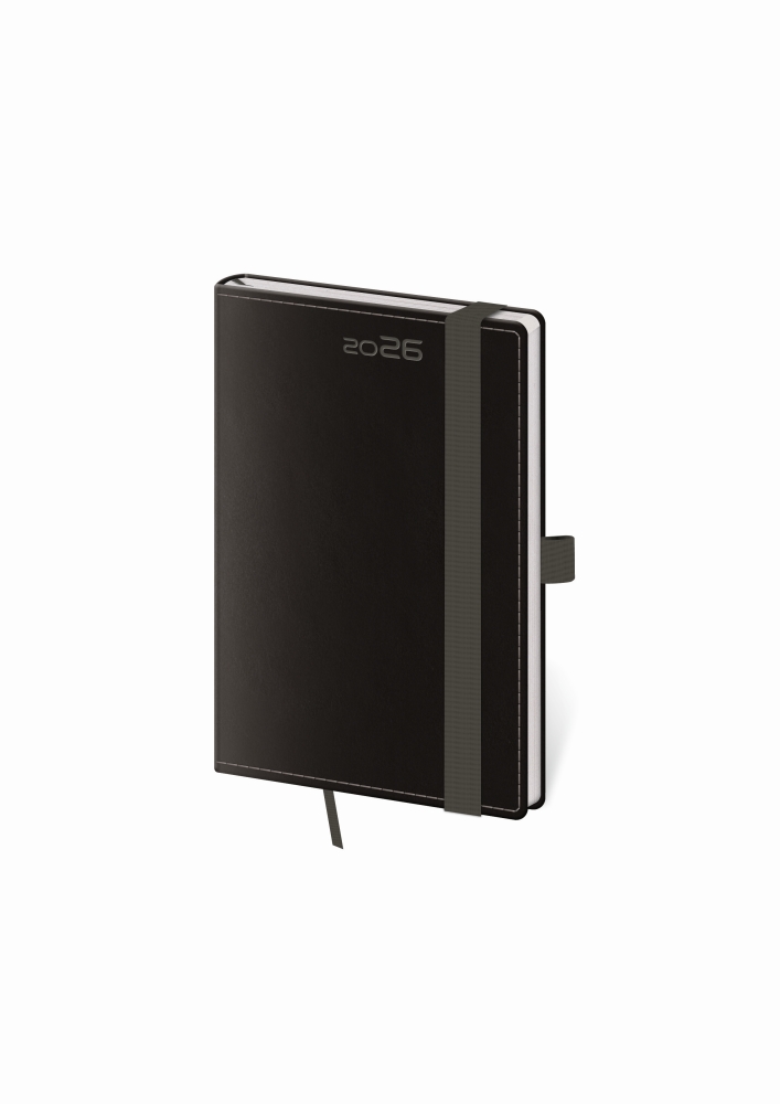 Desky diáře jsou zhotoveny z matného materiálu na bázi zušlechtěného papíru, který je bez struktury a tím neruší vzhled samotného produktu. Diář je doplněn o gumičku pro uzavření a poutko na propisku, kompletní design doplňuje obšití desek nití. Diář obsahuje: osobní údaje, plánovač dovolené (měsíční přehled), plánovací kalendář, telefonní předvolby, státní svátky České a Slovenské republiky, mezinárodní svátky, roční výhled, týdenní layout, adresář, mapa Evropy a České a Slovenské republiky. Rozměry: 12 x 16,5 cm. Minimální odběr 5 ks. Množství pak dále zvyšovat jen po 5 ks, tedy 5, 10, 15, 20 ks atd.