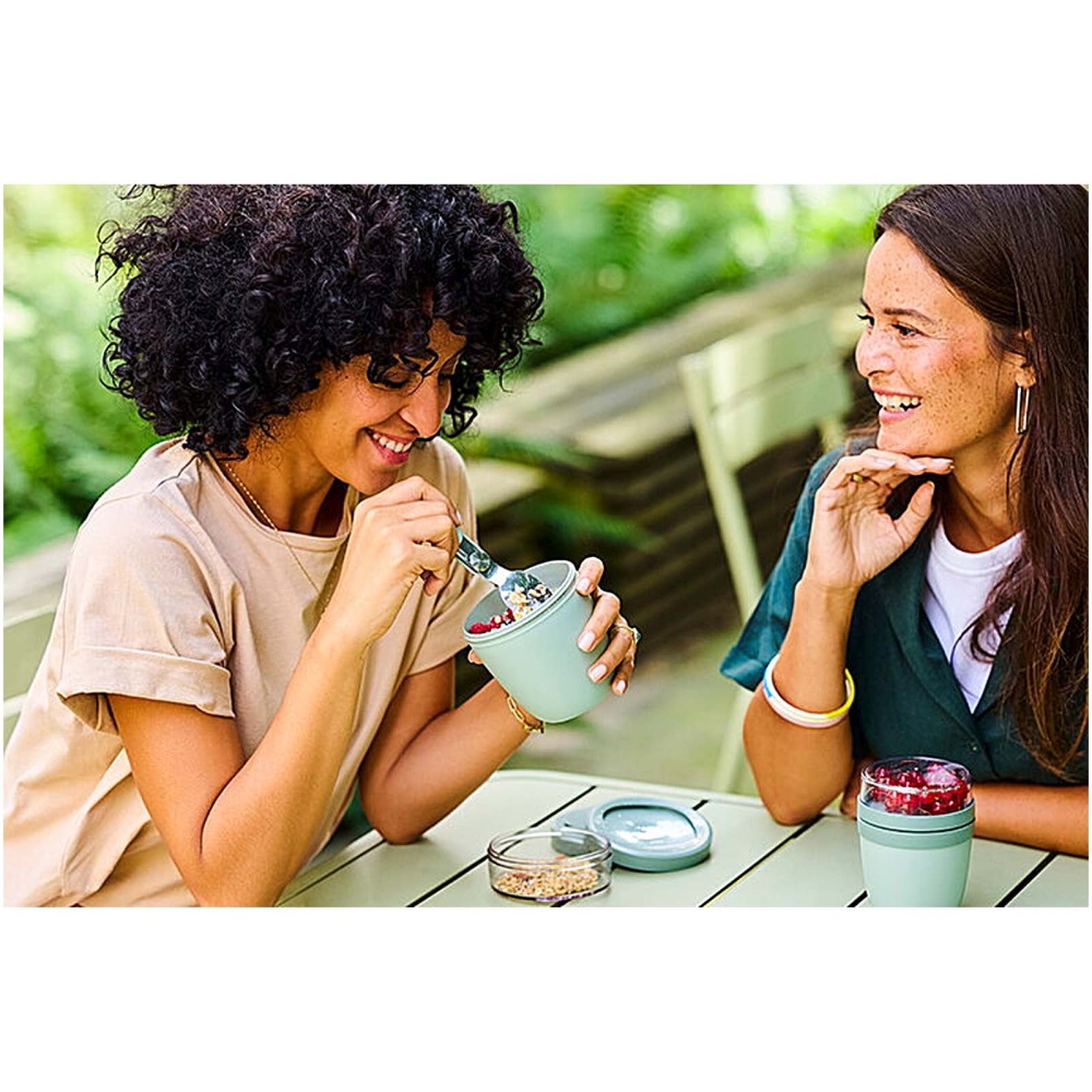Ideální box na jídlo na různé svačiny, jako je jogurt s müsli nebo polévka s krutony. Díky dvěma praktickým přihrádkám v jedné pevné nádobě zůstanou vaše ingredience pěkně oddělené. Díky kompaktním rozměrům se snadno vejde do školní tašky a lze ho použít na rychlý a praktický oběd. Horní průhledná nádoba pojme 120 ml, což je ideální na přibližně 50 gramů müsli nebo ovoce, a spodní nádoba má objem 300 ml. Dobře těsní a je vhodná do myčky na nádobí. Neobsahuje BPA. Rozměry: 12,8 x O 9,1 cm