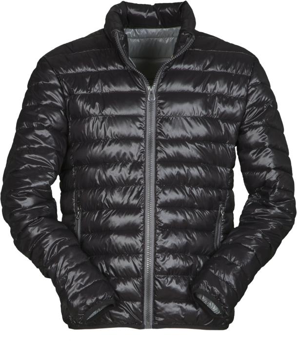 Pánská prošívaná bunda s šedou podšívkou, zapínání na zip, 2 vnitřní a 2 vnější kapsy, 100% nylon s lesklým efektem, uvnitř polyester - imitace peří. Kovové zipy s pogumovaným povrchem. Doporučená technologie tisku: sítotisk S3, výšivka.