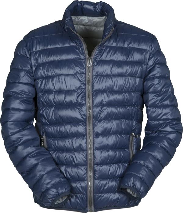 Pánská prošívaná bunda s šedou podšívkou, zapínání na zip, 2 vnitřní a 2 vnější kapsy, 100% nylon s lesklým efektem, uvnitř polyester - imitace peří. Kovové zipy s pogumovaným povrchem. Doporučená technologie tisku: sítotisk S3, výšivka.