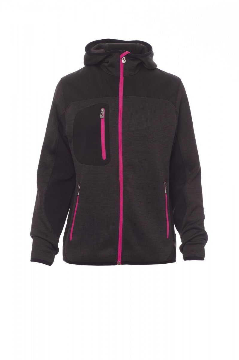 Dámská funkční bunda s dlouhým rukávem, zapínání na zip, kapuce, 3 kapsy na zip, kombinace pleteniny ze 100% polyester a softshellu, 300 gsm. Doporučená technologie tisku: výšivka.