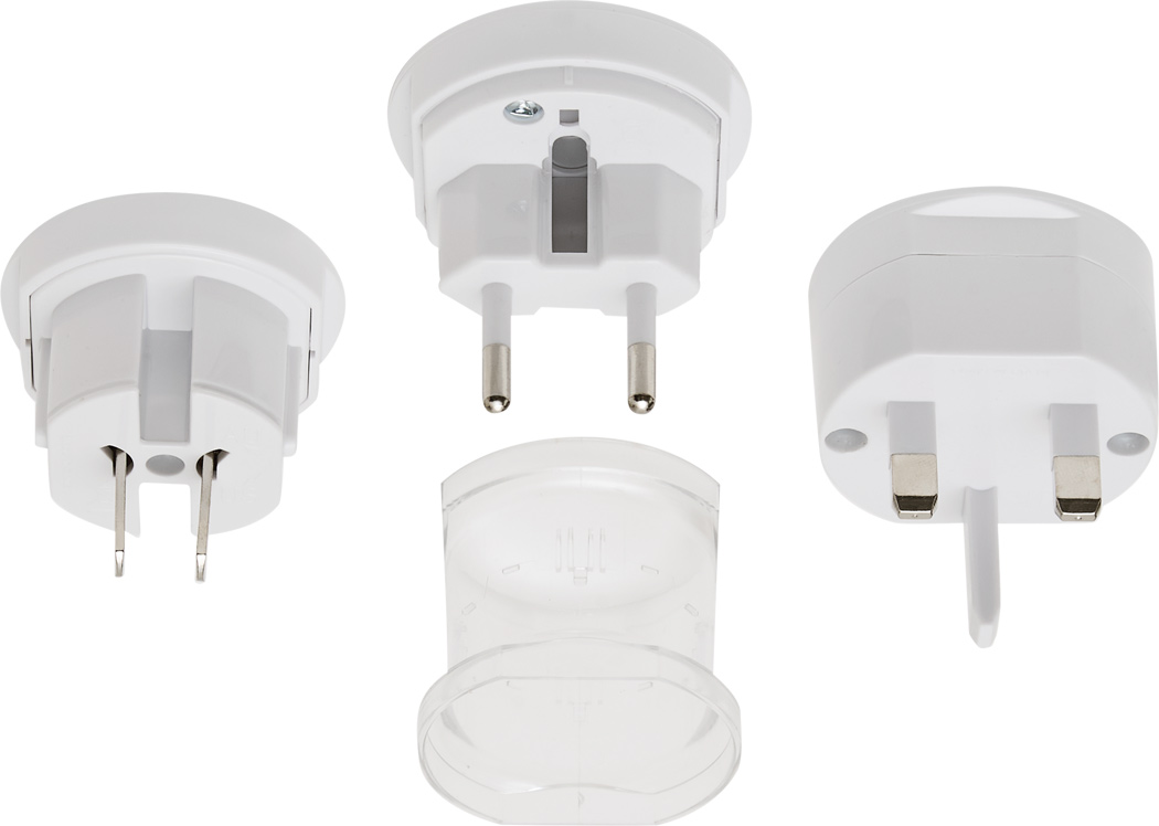 Cestovní adaptér se 3 konektory, pro Evropu, Asii, Austrálii a Severní Ameriku. Rozměr: O4,8 x 8,5 cm.