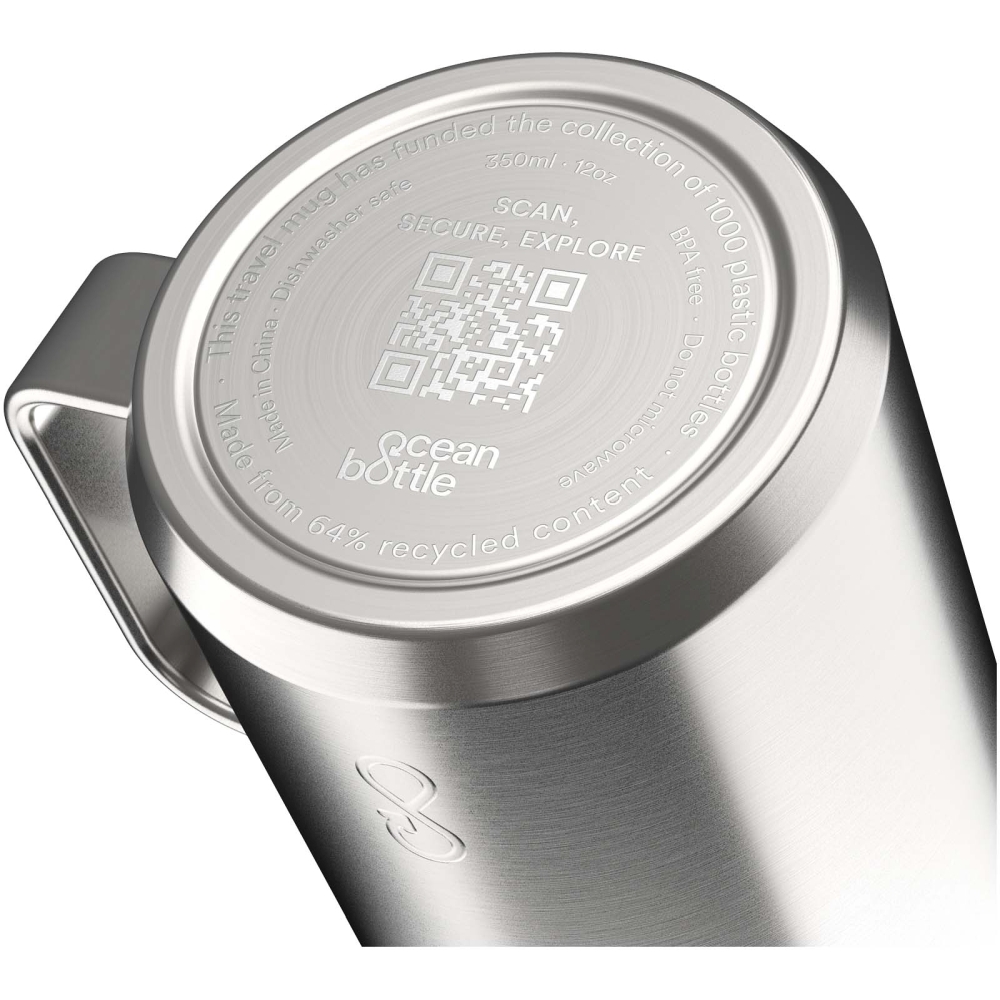 350ml cestovní hrnek Ocean Bottle má dvojitou tepelnou izolaci, která udrží nápoje teplé až čtyři hodiny a studené až deset hodin. Ergonomická rukojeť umožňuje připevnění k taškám nebo jiným předmětům pro optimalizaci úložného prostoru a nosnosti. Každý cestovní hrnek je zcela uhlíkově neutrální a představuje 1 000 sesbíraných plastových lahví pro zlepšení životní úrovně v pobřežních komunitách. Hrnek je vyroben z 90 % z recyklované nerezové oceli a dalších recyklovaných materiálů. Dodává se v dárkové krabičce z recyklované lepenky. Rozměry: 11,2 x O 12 cm