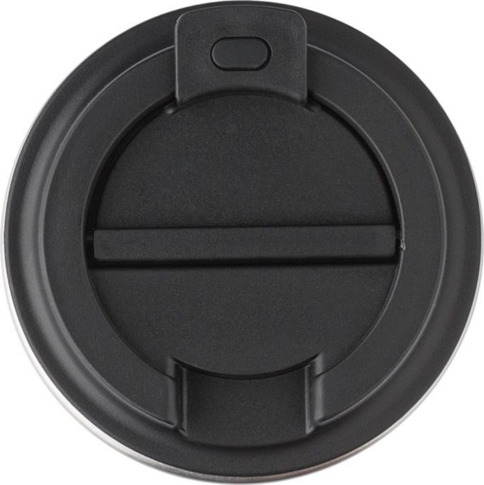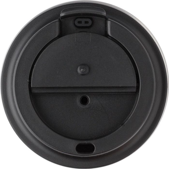 Cestovní hrnek z nerezové oceli a PP, 350 ml. Víčko se skládacím uzávěrem má silikonový těsnící kroužek. Jednotlivě balené v hnědé kartonové krabici. Rozměry: o 8,9 x 15 cm.