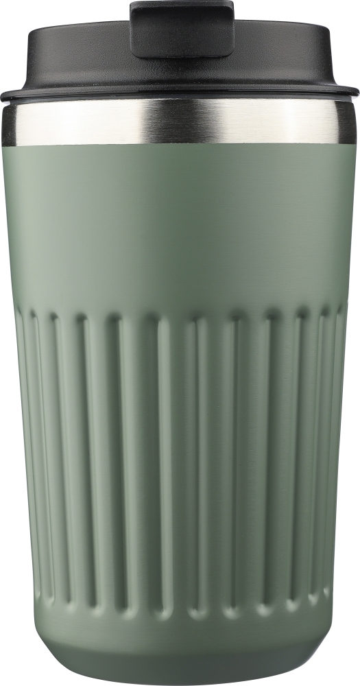 Cestovní hrnek z recyklované nerezové oceli (400 ml) s dvojitou stěnou a vnějšími výstupky. S víčkem z PP. Na těle je vyryté logo z recyklované oceli. Baleno v hnědé kartonové krabici. Rozměry: 8,7 cm x 15,6 cm