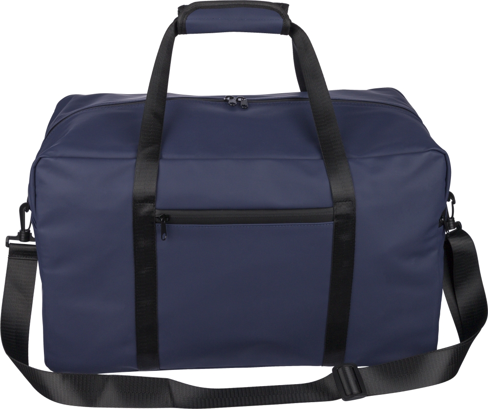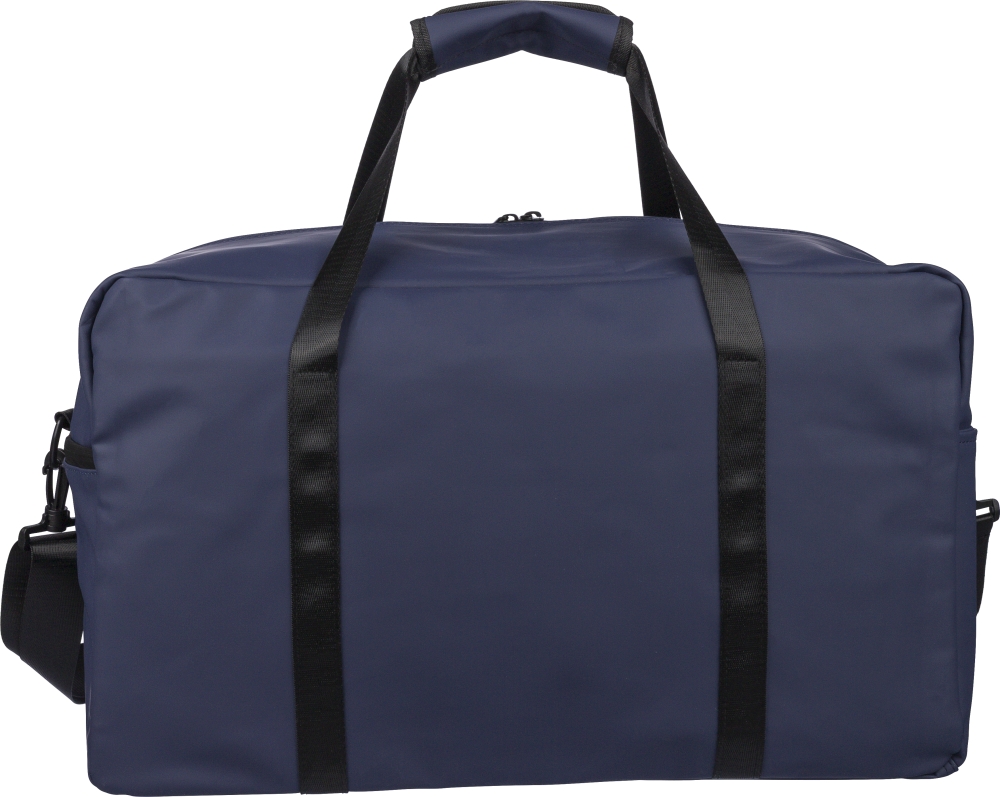 Recyklovaná PU cestovní taška (35 l) s podšívkou z recyklovaného polyesteru 210D. Má 108 cm dlouhá rukojeti (2,5 cm široká) se suchým zipem, 130 cm nastavitelný popruh (3,9 cm široký), přední kapsu na zip a velkou hlavní přihrádku. Recyklované logo uvnitř štítku. Rozměry: 29,5 cm x 49 cm