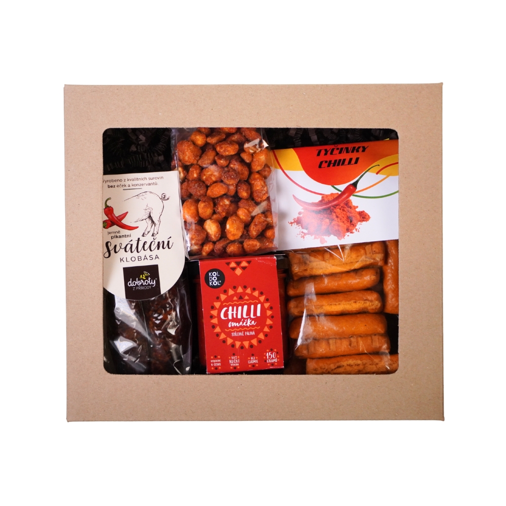 Dárková sada obsahuje: – sváteční vepřová klobása s chilli cca 90 g – tyčinky s chilli 100 g – arašídy v těstíčku s chilli 100 g – chilli omáčku 150 g Sadu lze převázat mašlí s navázanou komplimentkou nebo lze komplimentku vložit do krabice – v ceně není zahrnuto. Náhrada produktů vyhrazena dle dostupnosti. Termín dodání 12–14 dnů. Minimální odběr: 24 kusů. Rozměry: 20,2 × 22,2 × 7 cm.