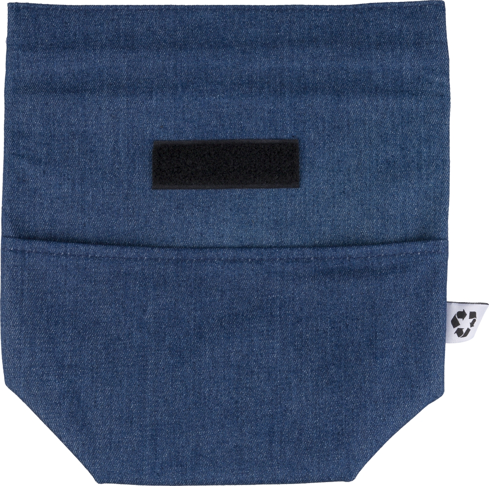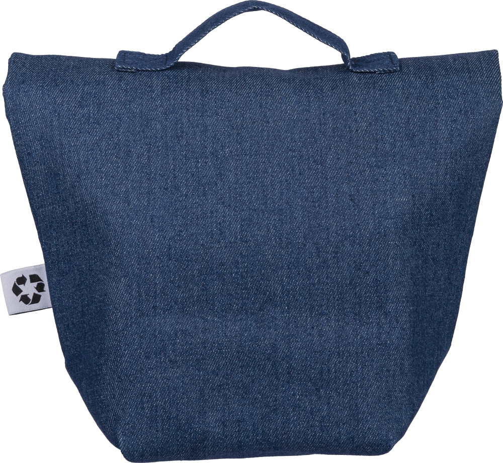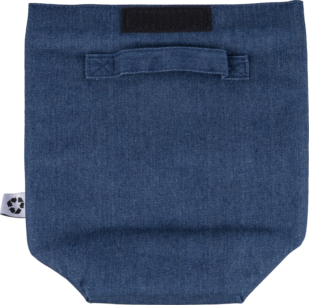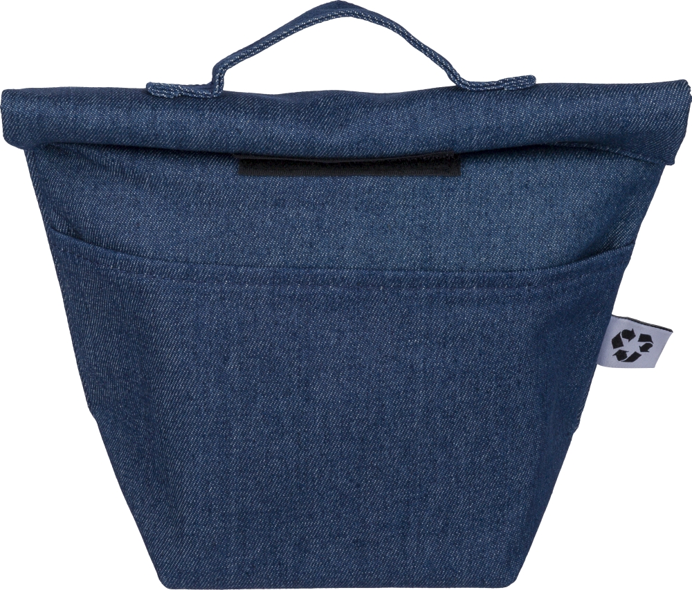 Chladicí taška s rolovacím víkem z recyklovaného denimu o rozměrech 27 x 10 x 31 cm. Zapínání na suchý zip, vnitřní strana z PEVA materiálu a krátké ucho pro přenášení. Přední kapsa a recyklovaný štítek na vnější straně. Rozměry: 31 cm x 27 cm