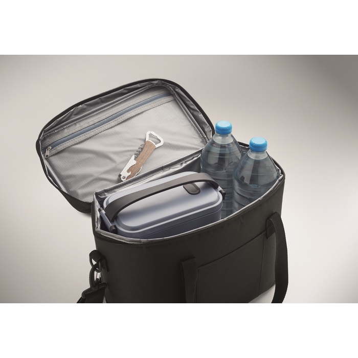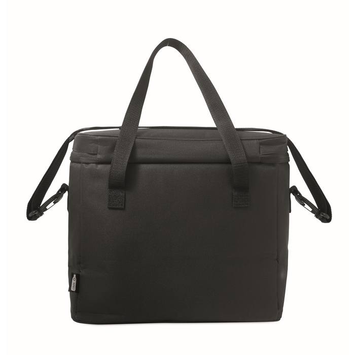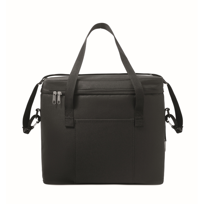 Chladicí taška z polyesteru 600D RPET s PU povlakem. Jedna přední kapsa a jedna vnitřní síťovaná kapsa. Izolační podšívka PEVA s 6mm PE pěnou. Dvě ucha a jeden nastavitelný ramenní popruh. Rozměry: 32 x 19.5 x 29 cm