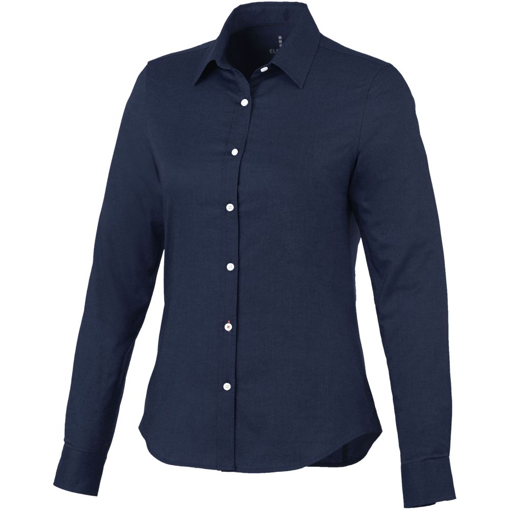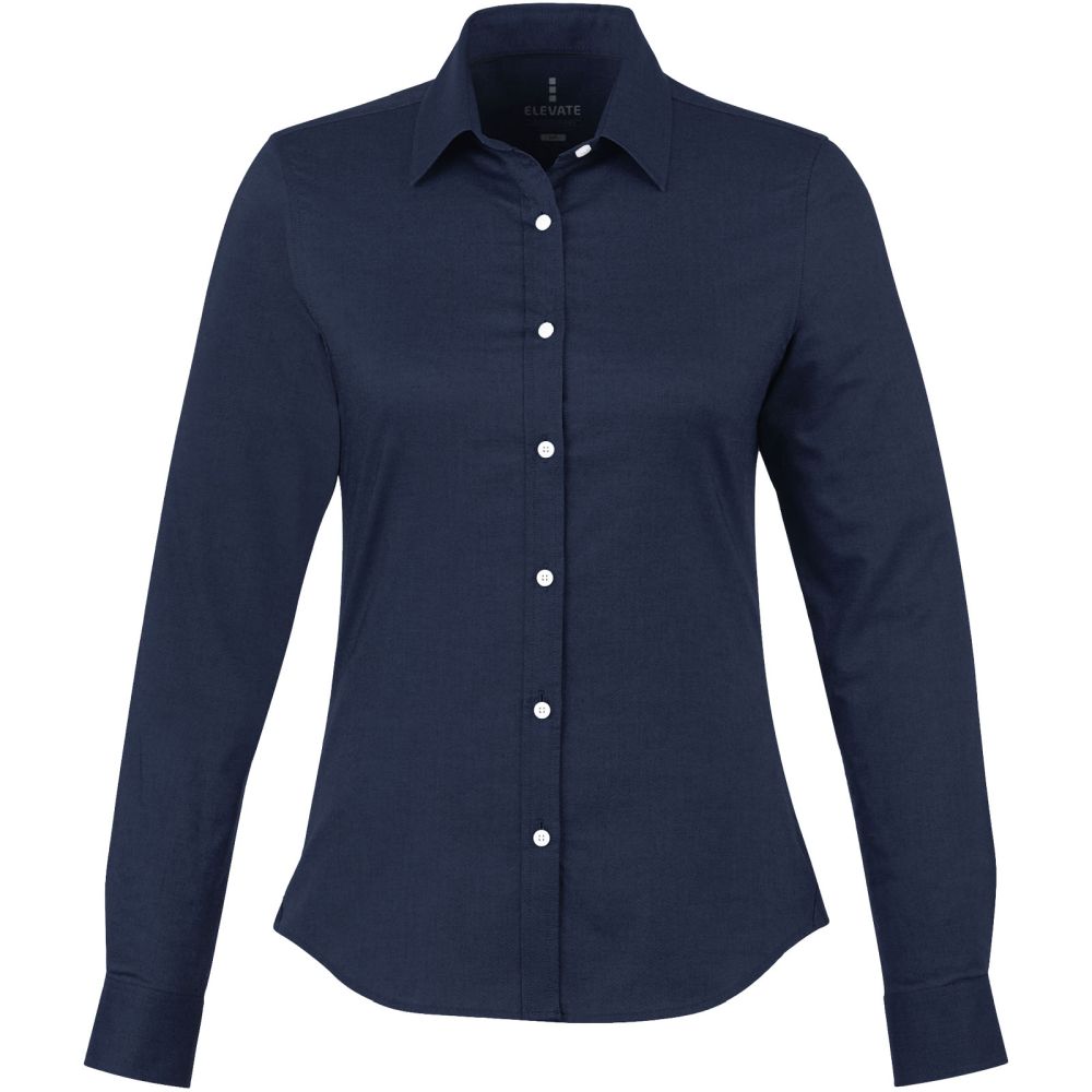 Dámská bavlněná košile s dlouhým rukávem, značka Elevate. Košile má nastavitelné manžety s jedním záhybem, gravírované perleťové knoflíčky, tvarované švy a zúžený pas pro zeštíhlující outfit, saténové lemování vnitřního výstřihu. Druhá knoflíková dírka od spodního lemu je s oranžovým stehováním. Oxford 100% bavlna, 142 g/m2.