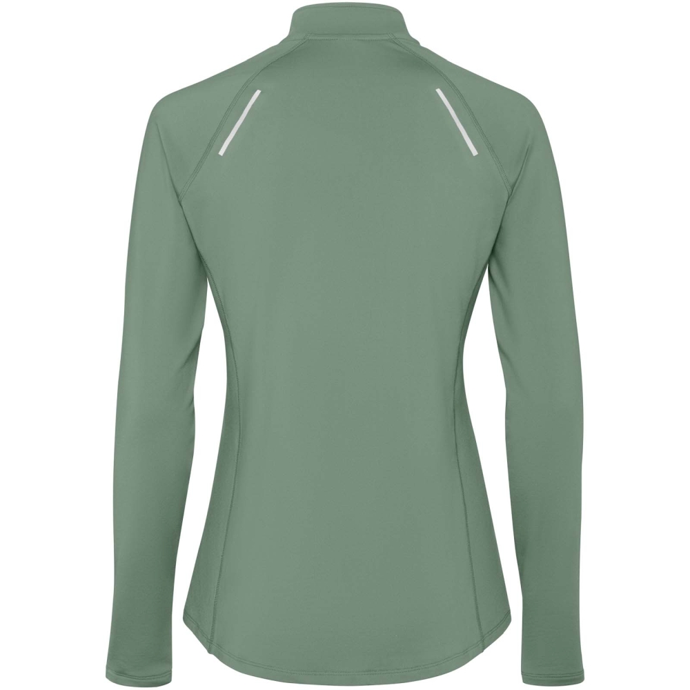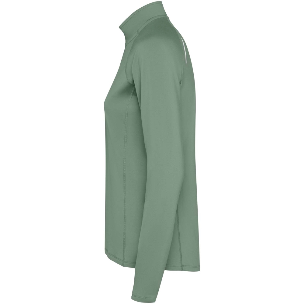 Dámská raglánová mikina s dlouhým rukávem. Slim-fit. Límec s obráceným designem na poloviční zip s reflexními detaily. Zesílené kryty švů. Manžety s otvory na palce. Reflexní detaily na zadní straně. Zadní lem je o něco delší než přední. Teplá kartáčovaná vnitřní tkanina.