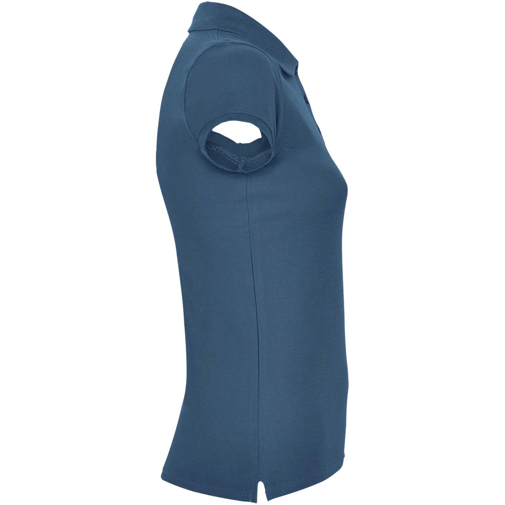 Dámské polo tričko s krátkým rukávem. Zesílené kryté švy ve vnitřním límci. Límec a manžety s žebrováním 1x1. Boční švy a vypasovaný střih. Úzké zapínání na 3 knoflíky. Boční rozparky. Odnímatelná etiketa.