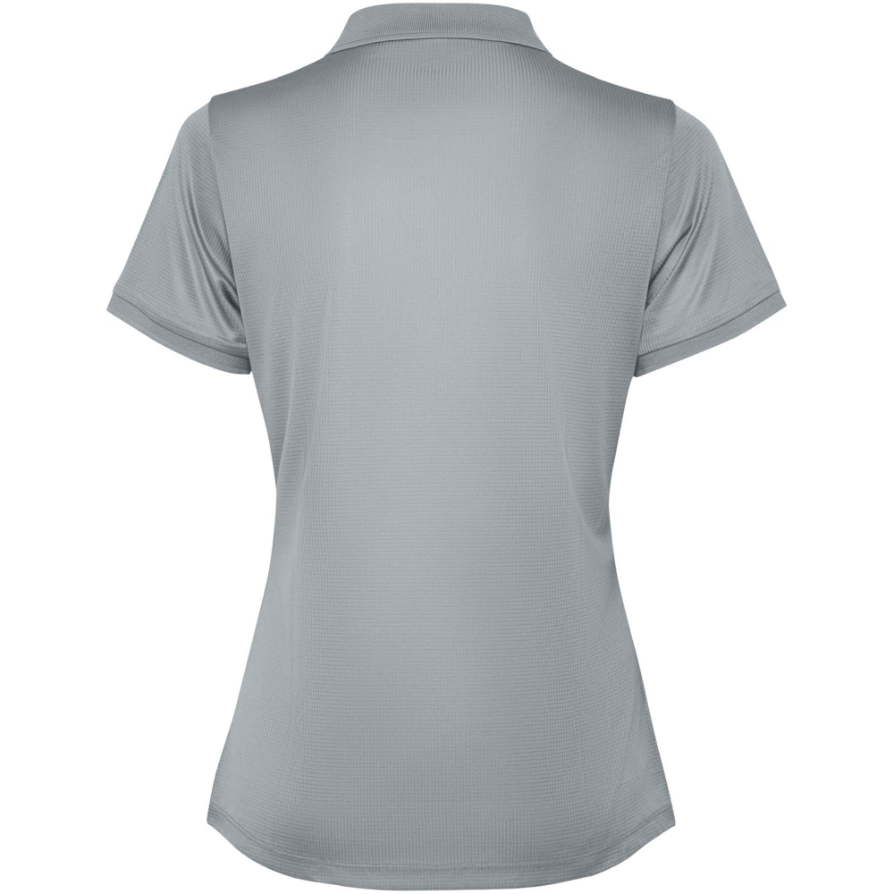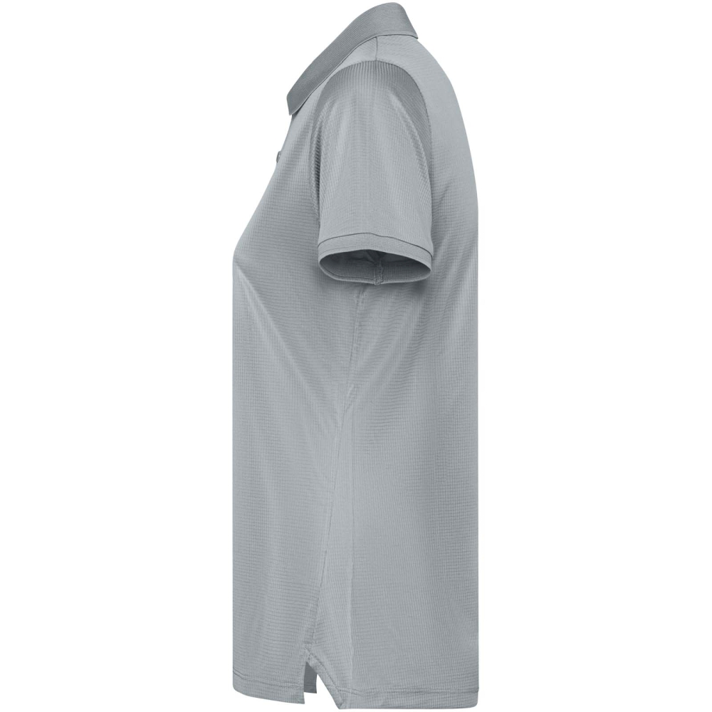 Dámské vypasované polo tričko s krátkým rukávem. Zesílené kryté švy ve vnitřním límci. 1×1 žebrované manžety a límeček. Boční švy. Zapínání na 3 knoflíky a boční rozparky.