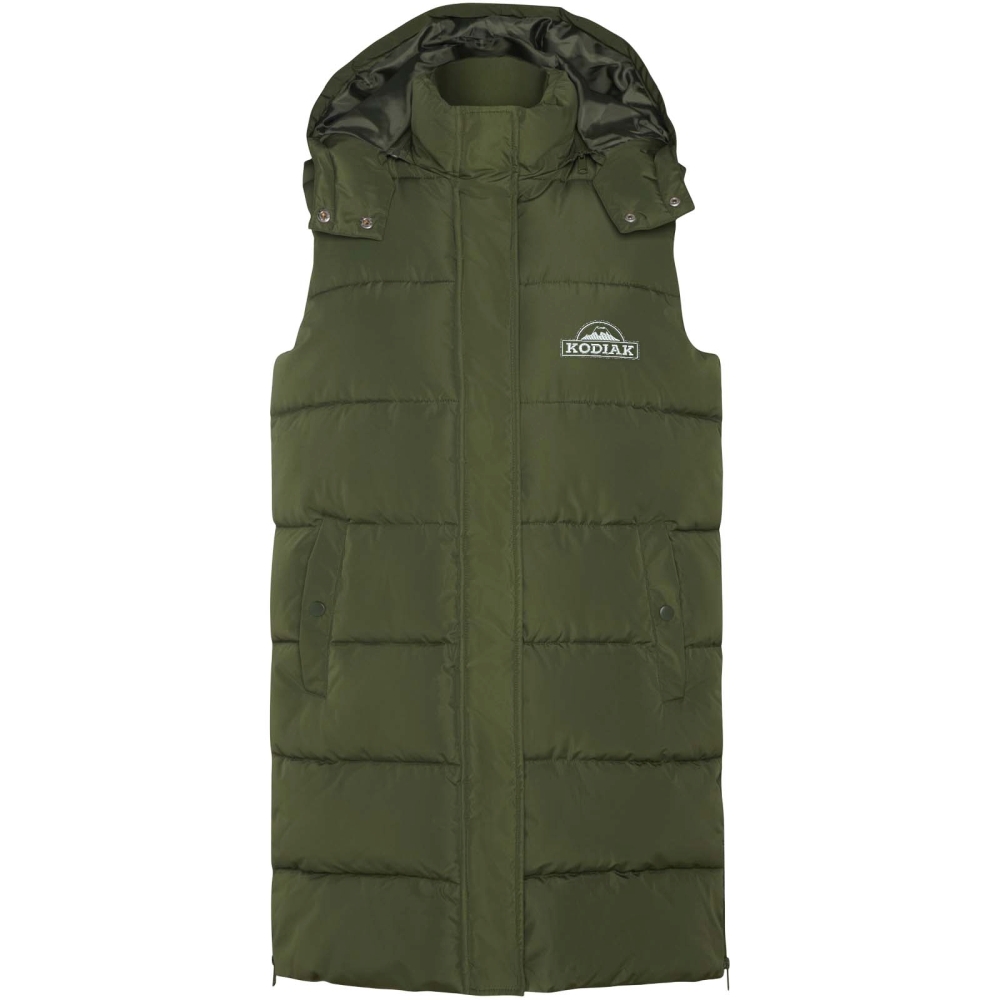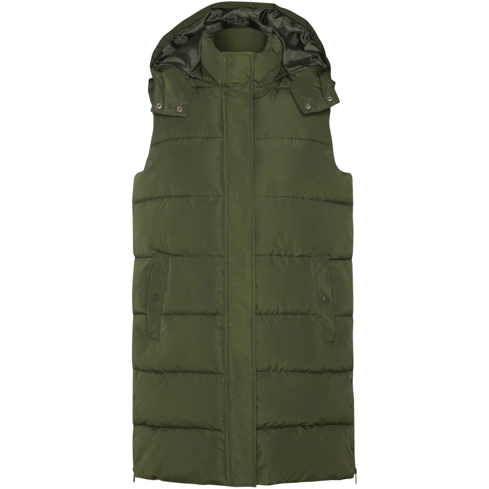 Polstrovaná vesta s odnímatelnou kapucí. Vysoký límec. Přední zapínání na zip krytý chlopní. Dvě kapsy se zapínáním na druky. Boční otvory se zipy. Vnitřní hrudní přístup. Voděodolné.