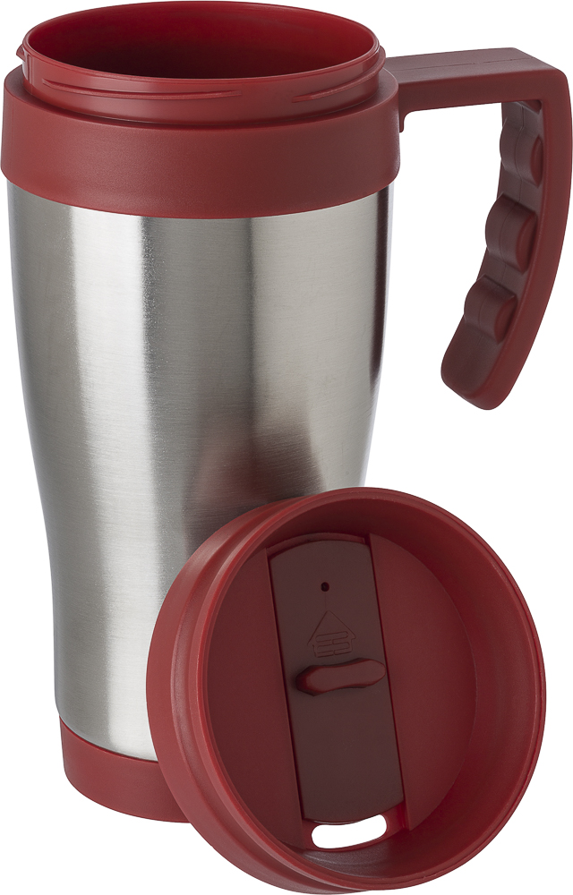 Nerezový cestovní hrnek s plastovým uchem a víčkem, objem 400 ml. Doporučená technologie tisku: laser. Rozměry: O 8,2 x 18 cm.