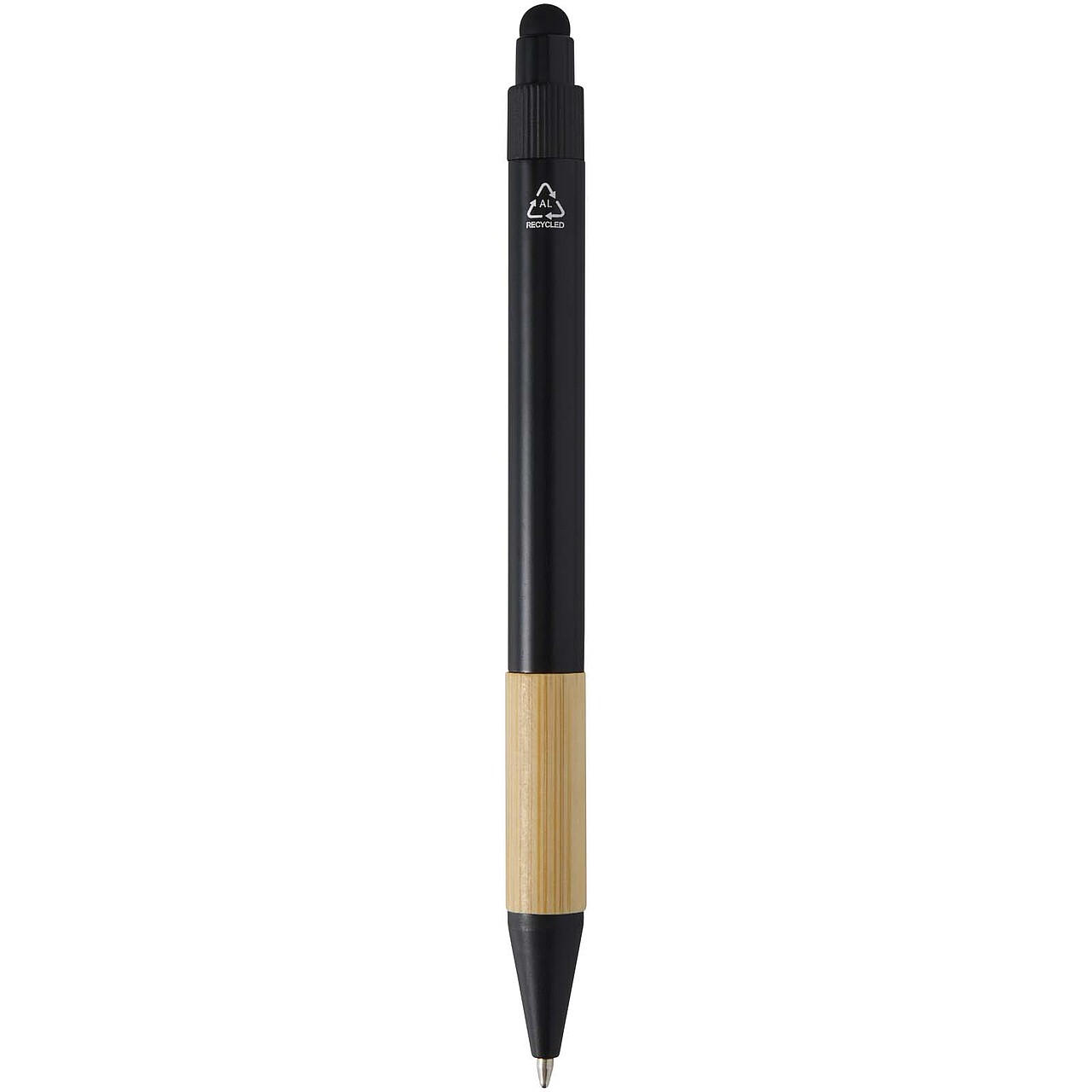 Dárková sada obsahuje kuličkové pero vyrobené z recyklovaného hliníku s certifikací RCS se stylovým bambusovým povrchem a stylusem, hliníkovou klíčenku (5,5 × 1,8 × 1 cm) s bambusovými detaily a integrovaným držákem na telefon a RFID pouzdro na karty (9,7 × 6,2 × 1 cm) s tělem z hliníkové slitiny a bambusovými detaily, které poskytuje ochranu až pro 10 karet. Pero obsahuje černý inkoust s délkou psaní 1000 metrů. Promyšlený a praktický dárek, který kombinuje funkčnost s moderním designem. Dodáváno v prémiové černé dárkové krabičce (16 × 16 × 2,7 cm) s jednobarevnou přední stranou, která je ideální pro přidání loga. Rozměry: 16 x 2,7 x 16 cm