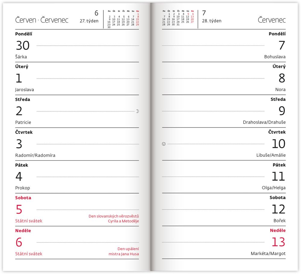 Tradiční celoplastové provedení kapesních diářů. Rozsah: 80 stran. Kalendárium: 14denní české jmenné. Rozměry: 8,5 x 15,4 cm.