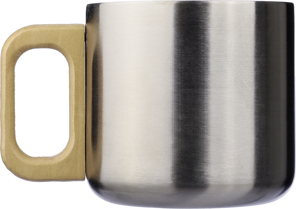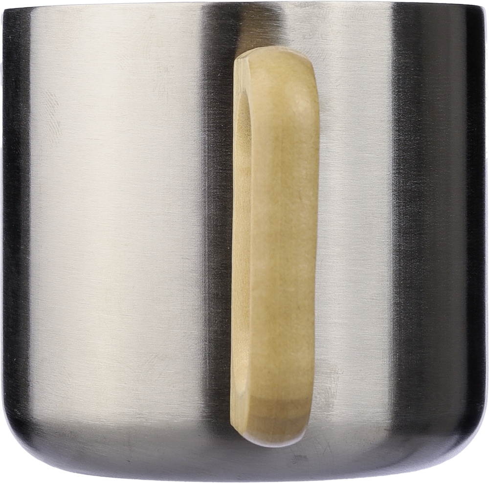Dvoustěnný hrnek z recyklované nerezové oceli s dřevěnou rukojetí o objemu 400 ml. Nevhodný do myčky nádobí. Baleno v dárkové krabičce. Rozměry: O 8,7 × 11,3 × 8,2 cm.