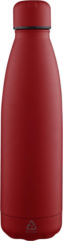 Láhev na pití z recyklované nerezové oceli s objemem 500 ml a dvojitou stěnou pro udržení teplých nebo studených nápojů až 12 hodin. Vnitřní plášť z nerezové oceli zajišťuje vynikající odolnost, odolnost proti korozi a bezpečný kontakt s potravinami a nápoji. Povrchová úprava v hladkém matném odstínu. Šroubovací víčko a dno jsou sladěny v barvě pro čistý a jednotný vzhled. Na přední straně těla je vyryté recyklované logo. Baleno jednotlivě v hnědé kartonové krabici. Rozměry: 7 x 26 cm