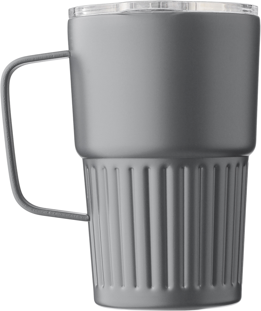 Dvoustěnný hrnek z recyklované nerezové oceli (450 ml). S vroubkovanou robustní rukojetí. S víkem AS s posuvným uzávěrem. Na těle je vyryté recyklované logo. Jednotlivě baleno v hnědé kartonové krabici. Rozměry: 8,7 x 14 cm