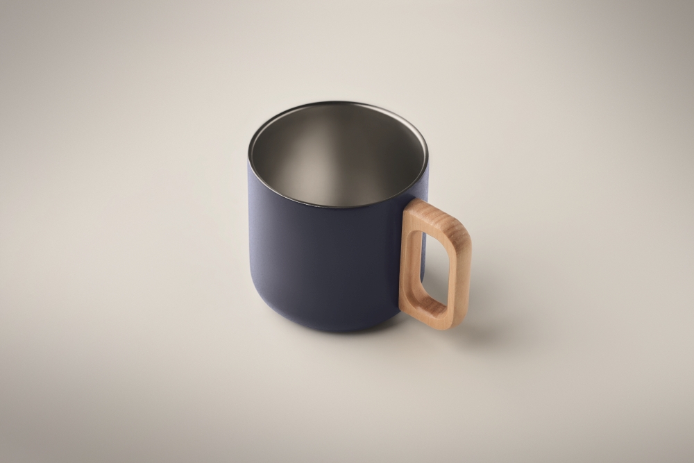 Dvoustěnný hrnek z recyklované nerezové oceli (90 % recyklované nerezové oceli a 10 % nerezové oceli) s dřevěným uchem. Objem: 350 ml. Rozměry: O 8,5 x 8 cm. Materiál: nerezová ocel
