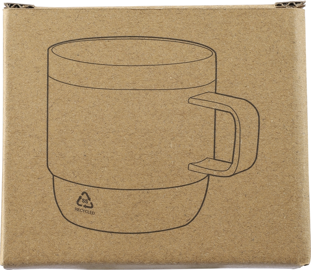 Hrnek z recyklované nerezové oceli (180 ml) s dvojitou stěnou, keramickým vnitřním povlakem, rukojetí a laserově gravírovaným logem z recyklované nerezové oceli. Baleno v hnědé kartonové krabici. Rozměry: 7,5 cm x 10 cm