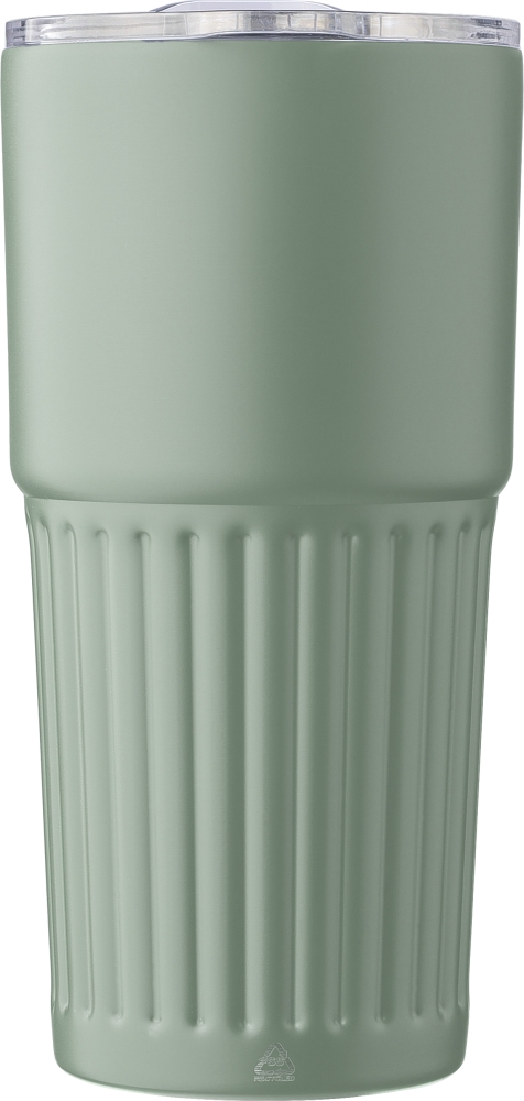 Dvoustěnný hrnek z recyklované nerezové oceli (500 ml) s víčkem z PP a odpovídajícím popruhem na nošení. Udrží obsah teplý 5 hodin a studený 8 hodin. Na lahvi je vyryto recyklované logo. Jednotlivě baleno v hnědé kartonové krabici. Rozměry: 9 cm x 18 cm x 9 cm