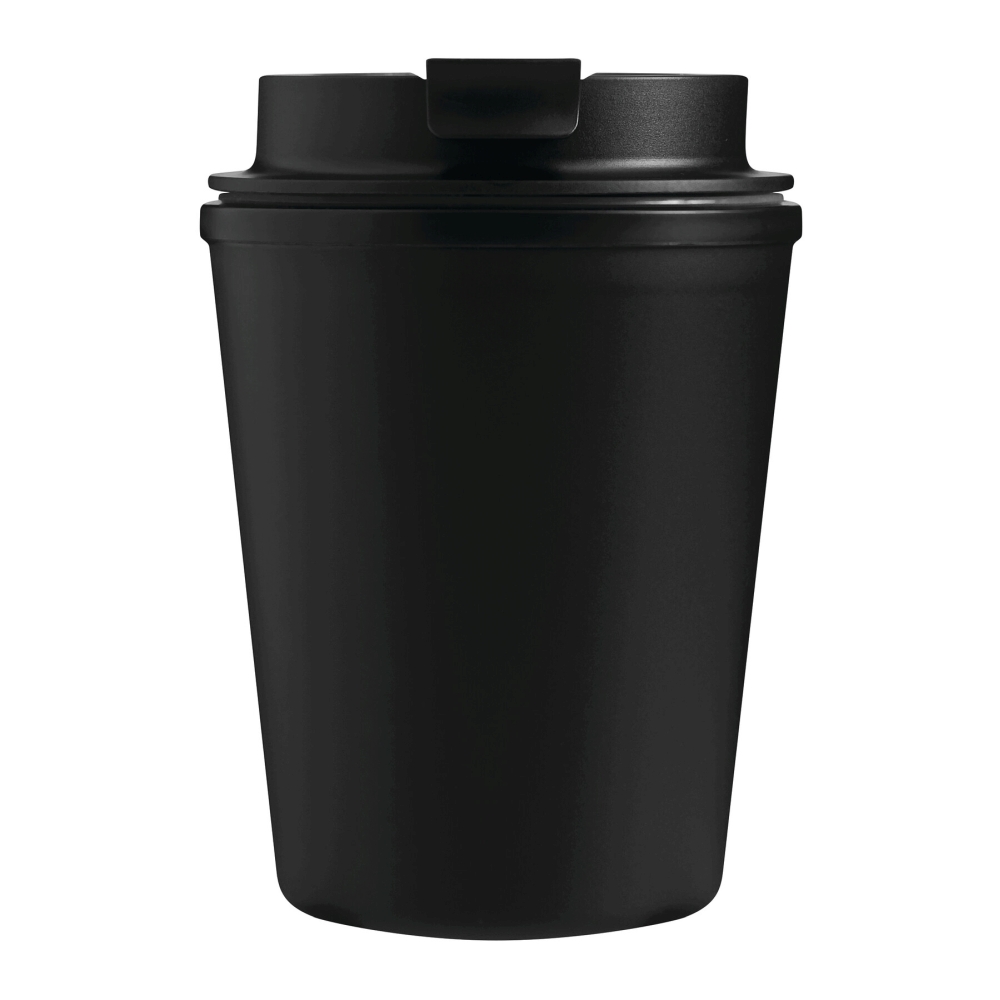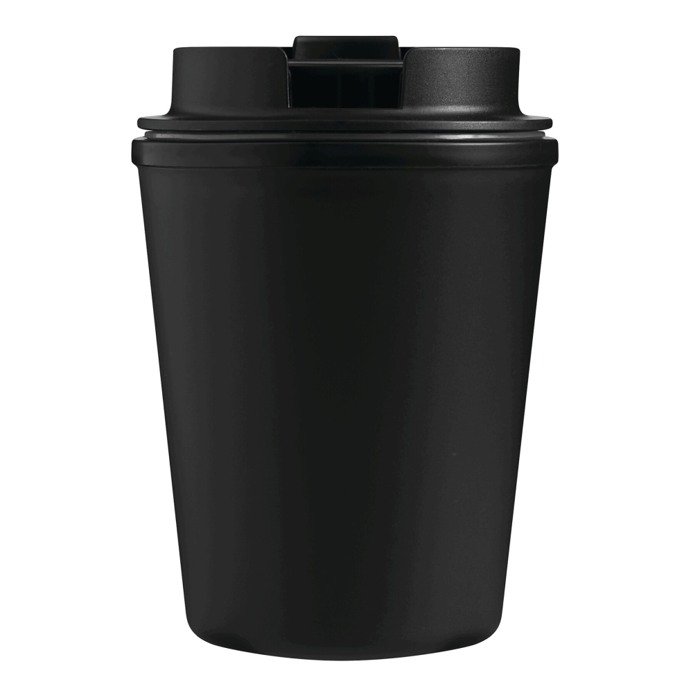 Dvoustěnný izolovaný hrnek, uvnitř i vně z plastu, bezpečný šroubovací uzávěr se silikonovým těsněním a integrovaným výklopným otvorem pro pití, objem cca 350 ml, udrží teplé nápoje cca 2 hodiny a studené až 4 hodiny. Rozměry: O9,2 x 13 cm
