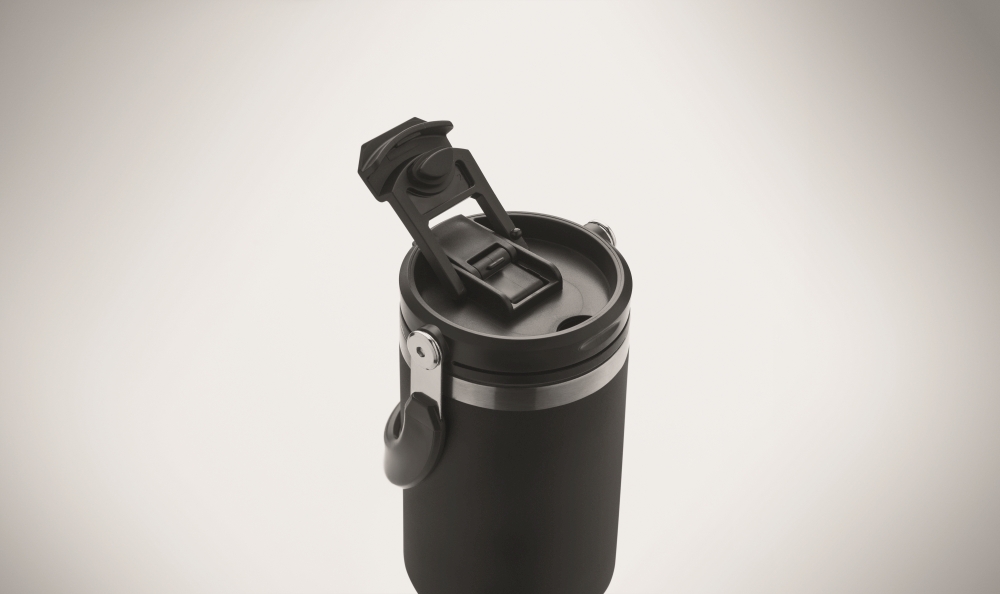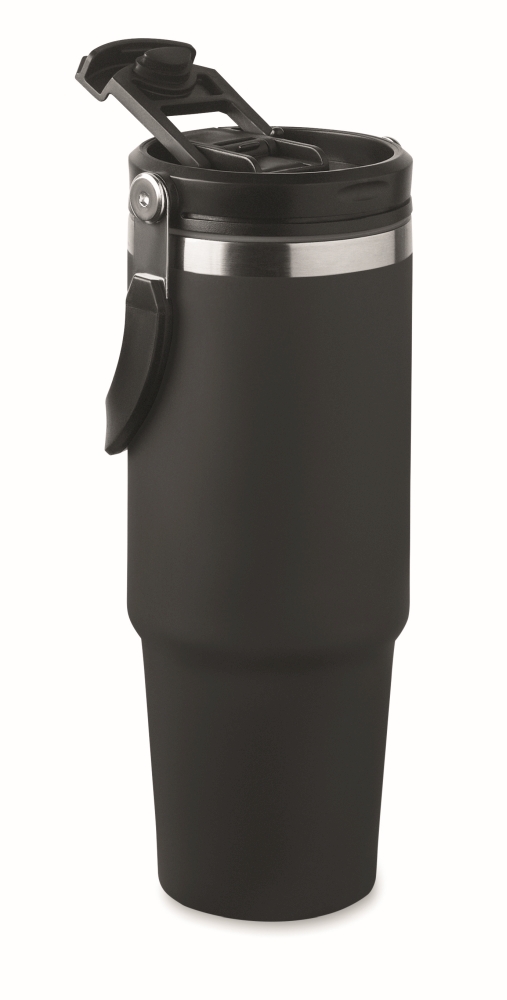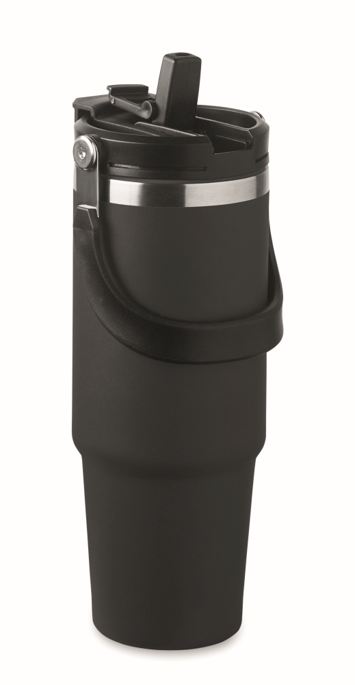 Dvoustěnný hrnek XXL z recyklované nerezové oceli (90 % recyklované nerezové oceli a 10 % nerezové oceli) s praktickou rukojetí. Hrnek obsahuje víčko s vnitřním brčkem a přímým otvorem na pití. Objem 850 ml. Rozměry: O 8,5 × 23,5 cm.