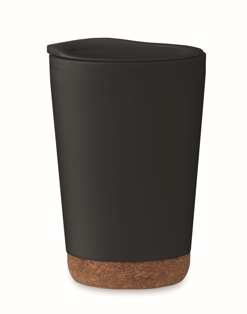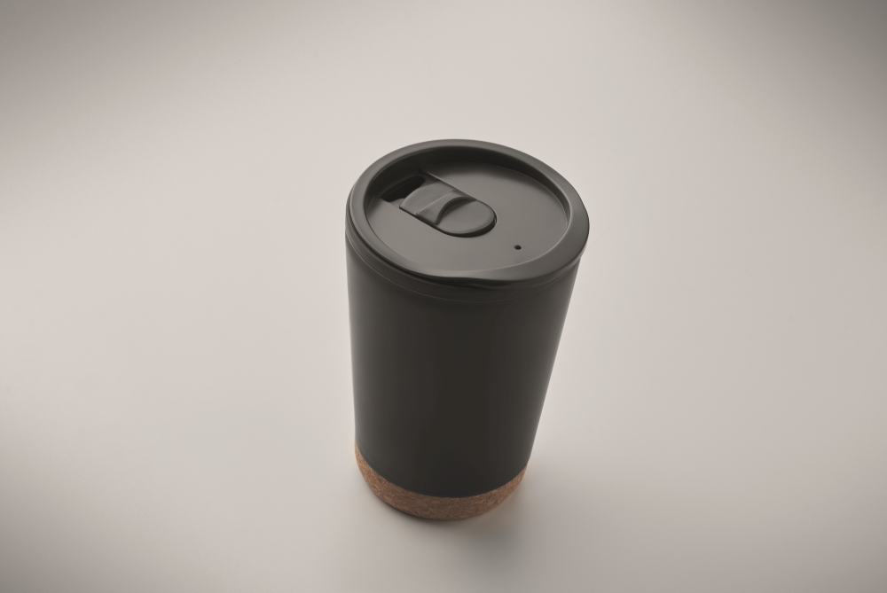 Dvoustěnný pohárek z PP s korkovým dnem a posuvným uzavíracím víčkem s náustkem z PS a ABS. Objem: 300 ml. Rozměry: O 8 x 12 cm