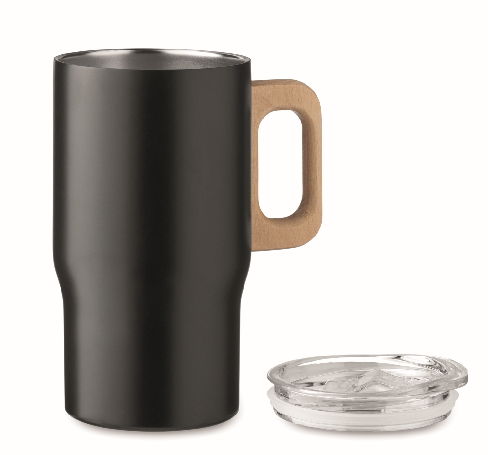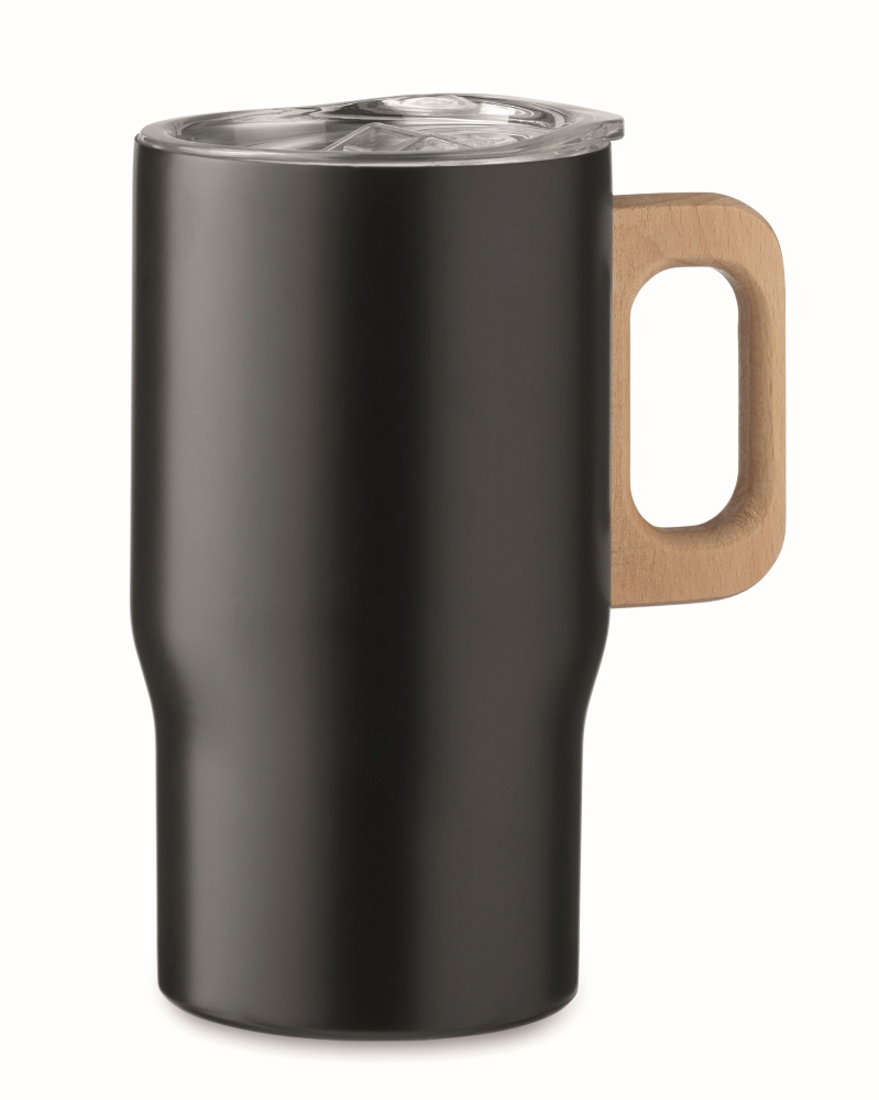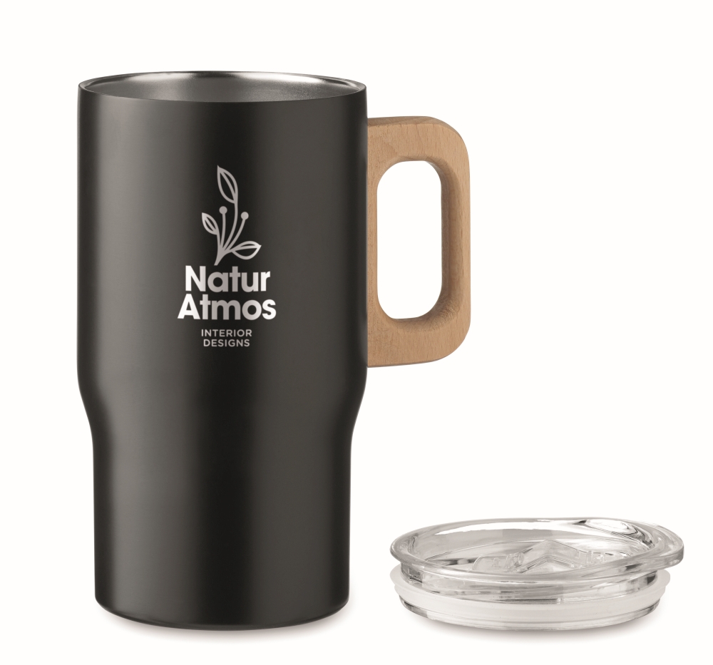 Dvoustěnný hrnek z recyklované nerezové oceli (90 % recyklovaná nerezová ocel a 10 % nerezová ocel) s dřevěnou rukojetí a víčkem s posuvným zavíráním. Objem 350 ml. Rozměry: 11 × 14 cm.